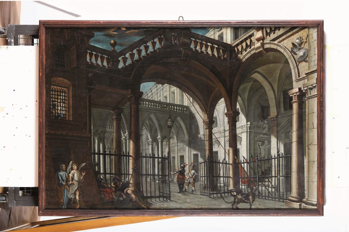 Scuola italiana del XVIII secolo Scorcio architettonico con la liberazione di San Pietro