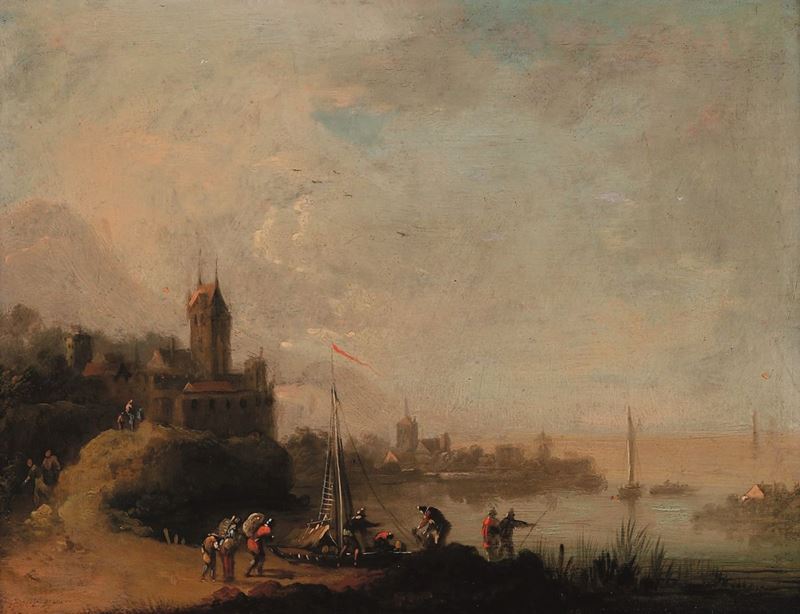 Paesaggi costieri con imbarcazioni e figure