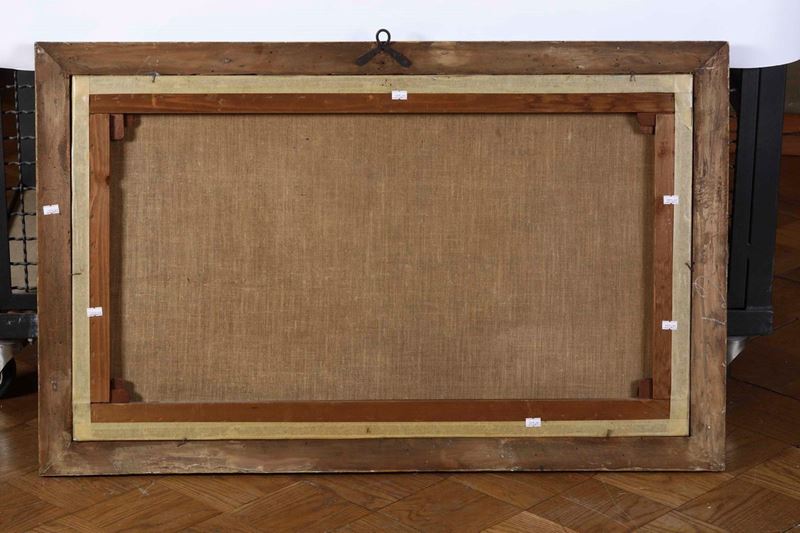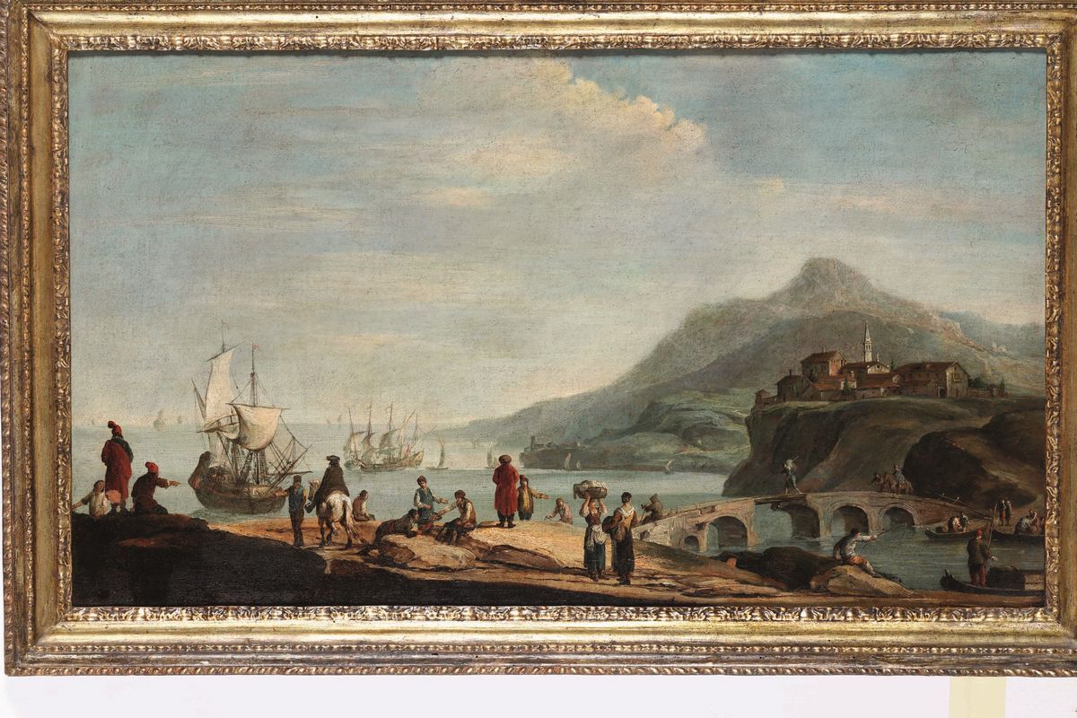 Veduta con ponte, imbarcazioni e personaggi sulla riva