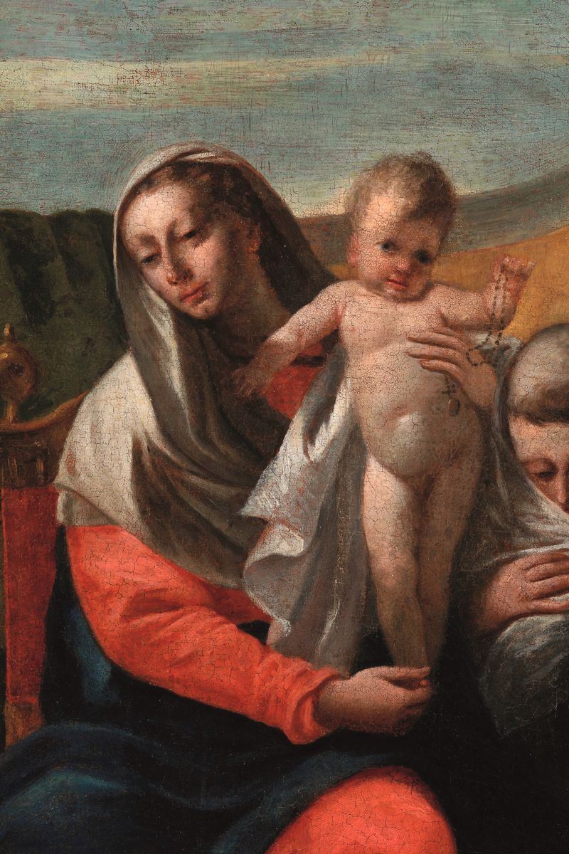 "La pala qui rappresentata, raffigurante Madonna in trono con i santi Antonio, Francesco e Gaetano da Thiene, deriva da una delle creazioni più belle di Giambattista Tiepolo. Di essa, infatti, esiste di questo maestro una versione quasi uguale al Museo Puskin di Mosca e, ancora, esistono vari bozzetti con alcune varianti (Coll. Mayer di Roma; Coll. priv. di Zurigo; Coll. già Corsini di New York; già Finarte Milano) tutte attribuite a Giambattista.