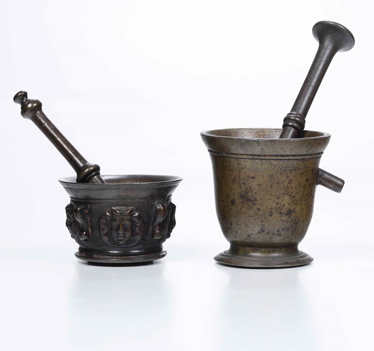 Due antichi mortai con pestelli in bronzo