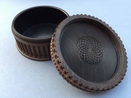 La scatola in ebano, Inghilterra, probabilmente XIX secolo, è interamente lavorata al tornio, anche all'interno del tappo. La grolla, del XIX secolo, interamente scolpita, poggia su tre zampe leonine