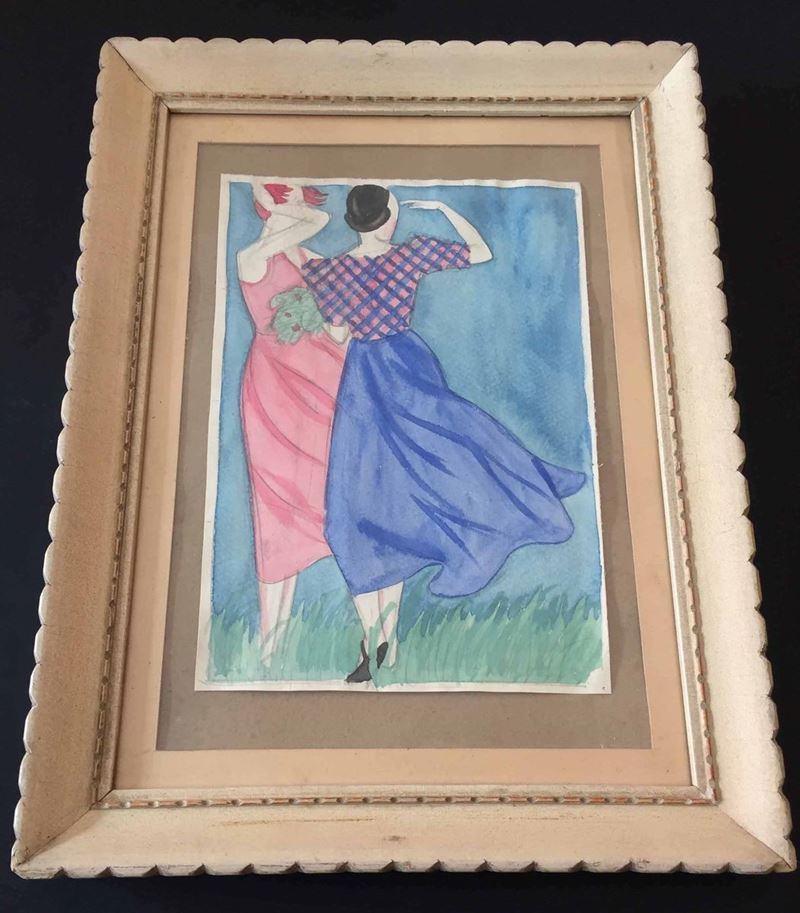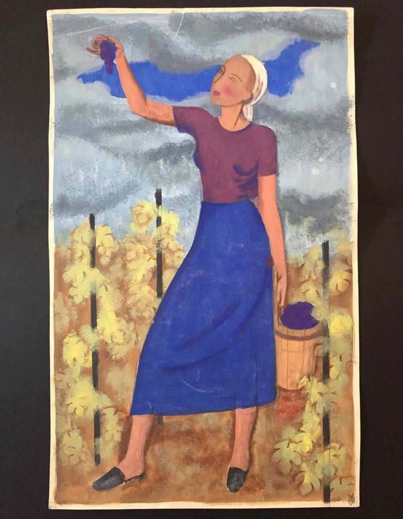 Due bozzetti “Donne in una giornata ventosa”, tempera, in cornice; “Ragazza che vendemmia”, tempera