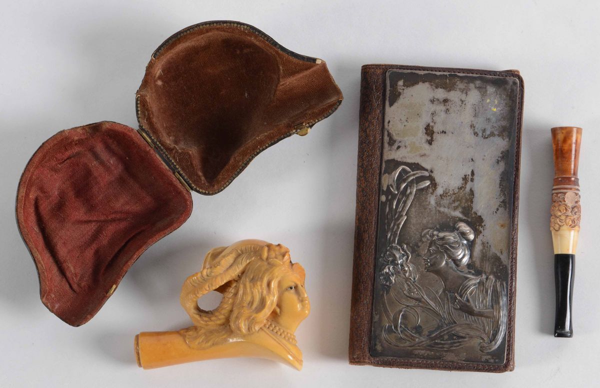 Lotto composto da un portafoglio in argento e pelle epoca Liberty, una pipa in schiuma scolpita e un bocchino in schiuma