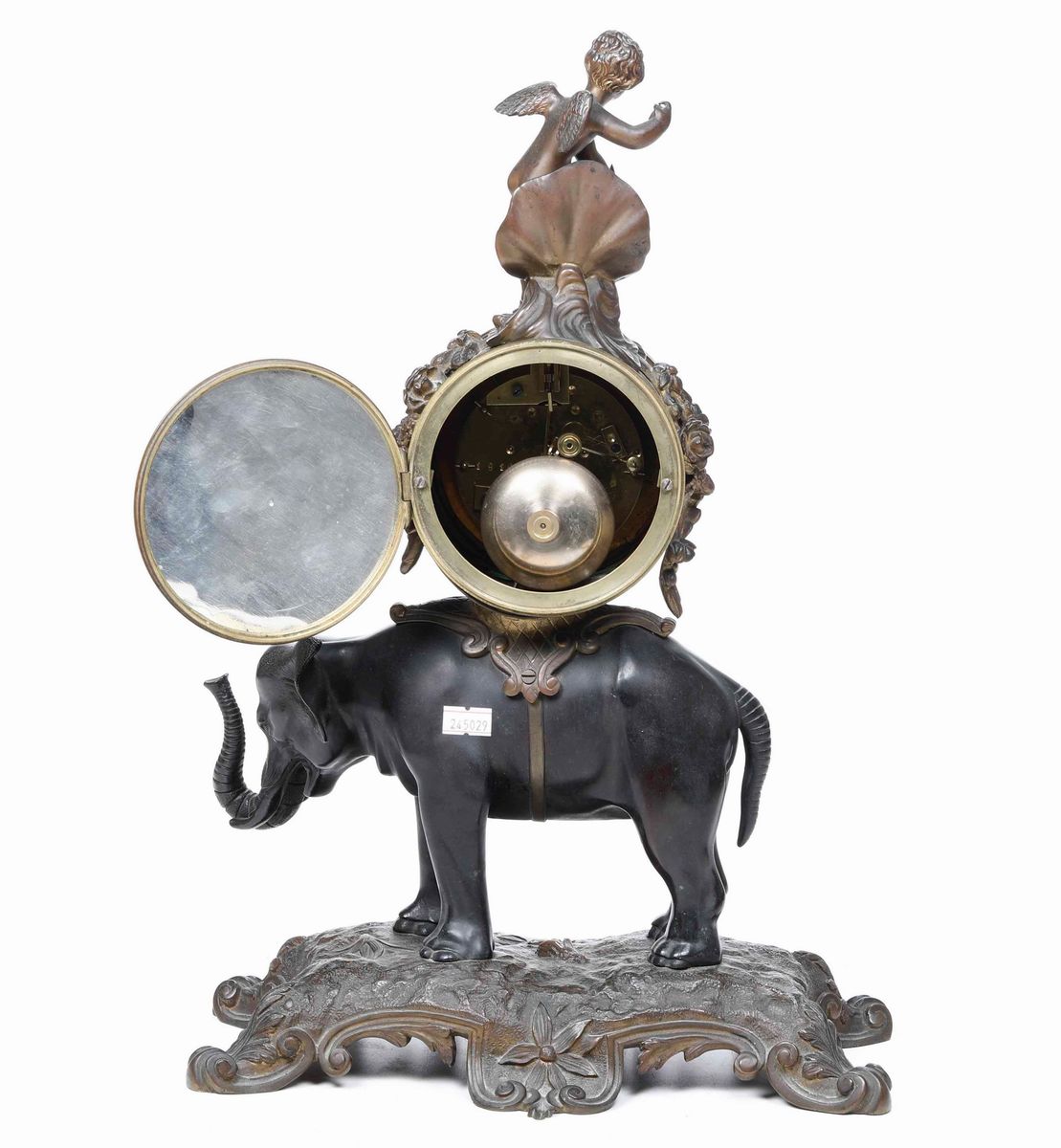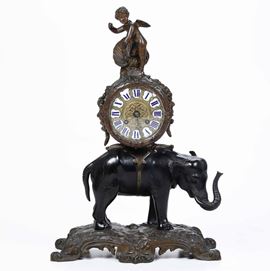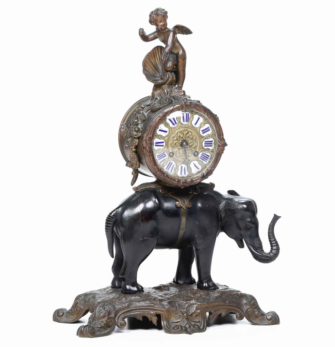 Cassa scolpita a elefante a tutto tondo che sorregge il quadrante sormontato da putto. Quadrante a cartouches a numeri romani