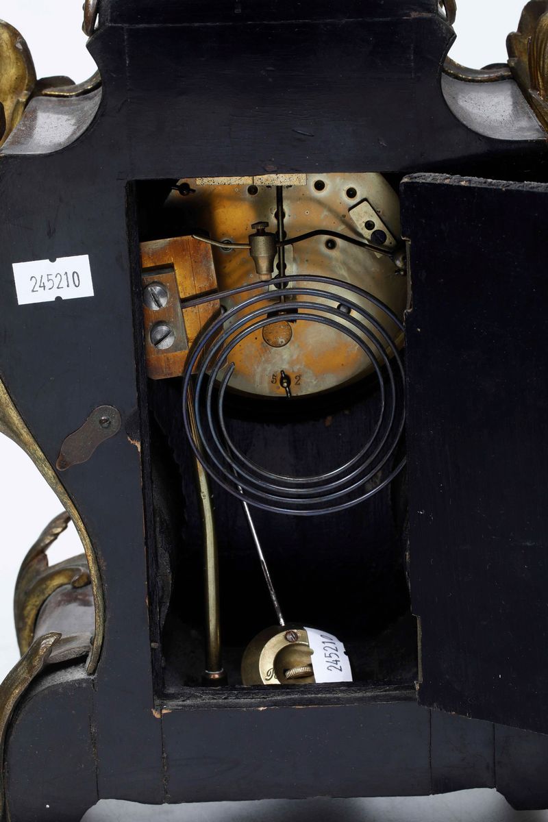 Pendola da tavolo con cassa lastronata in tartaruga e legno, XIX secolo