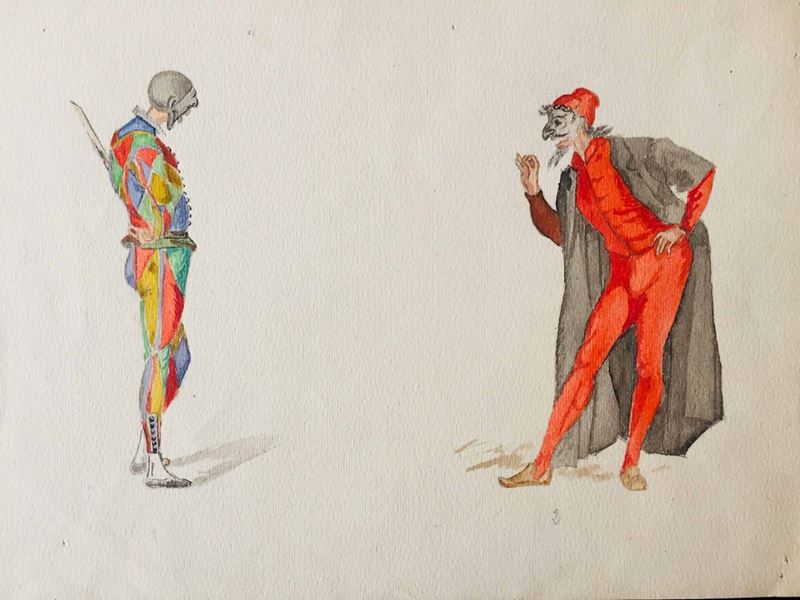“Giovane donna in abito fin de siècle”, cm 28 x 17; “Arlecchino e Pantalone”, cm 31 x 21; “Personaggi su lago (dipinto anche sul retro)”, cm 38 x 23; “ Paesaggio con torrione e barche”, cm 22 x18