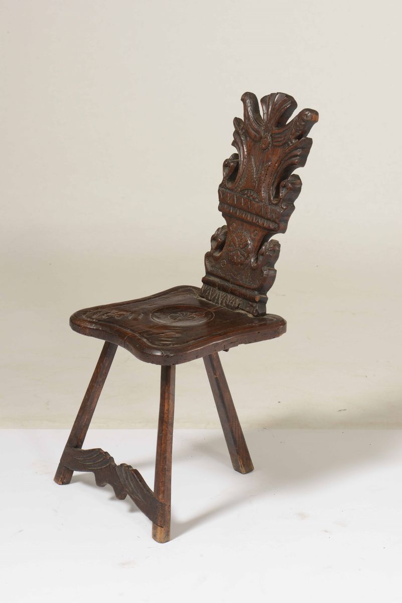 Sedia tripode in legno intagliato