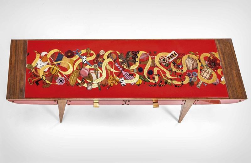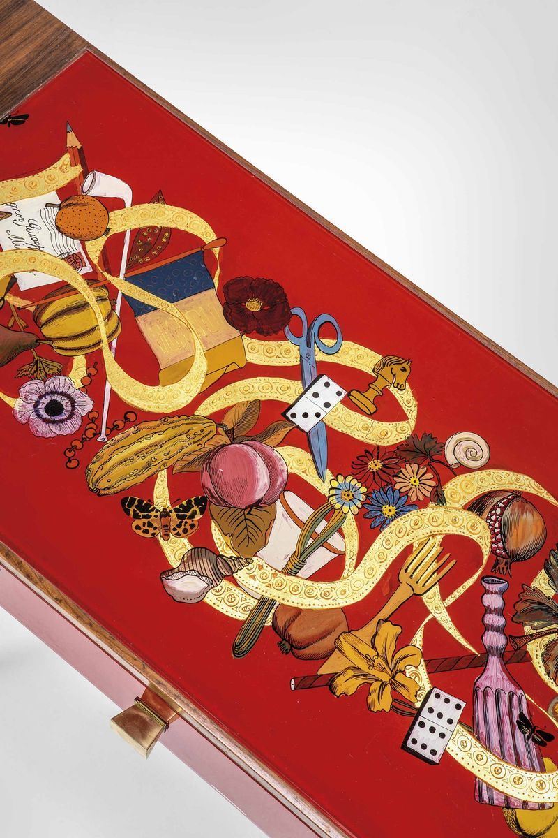 Struttura in legno e rivestimenti in cristallo molato retro dipinto su foglia d’oro. Decoro ad opera di Piero Fornasetti.