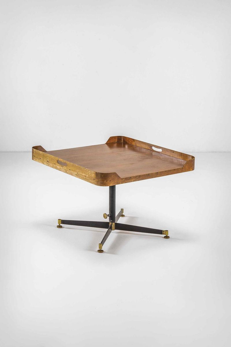 Piano rivestito in panno e vassoio in legno sovrapponibile a incastro. Struttura in metallo laccato e ottone.