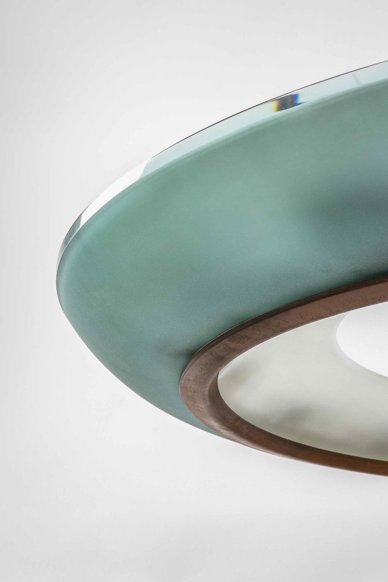 Struttura in ottone. Diffusore esterno in cristallo colorato curvato molato satinato, diffusore interno in cristallo curvato molato satinato.