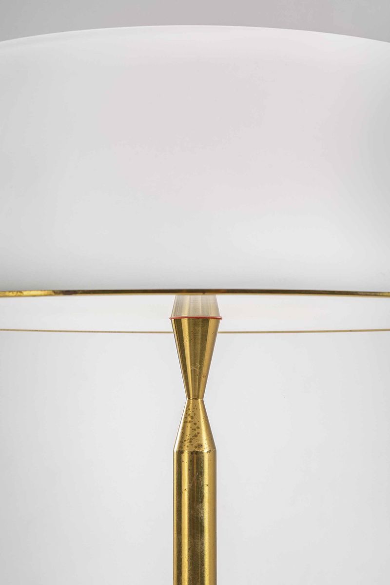 Struttura in ottone e paralume in vetro opalino e vetro satinato. Prod. Fontana Arte, Italia, 1960 ca.