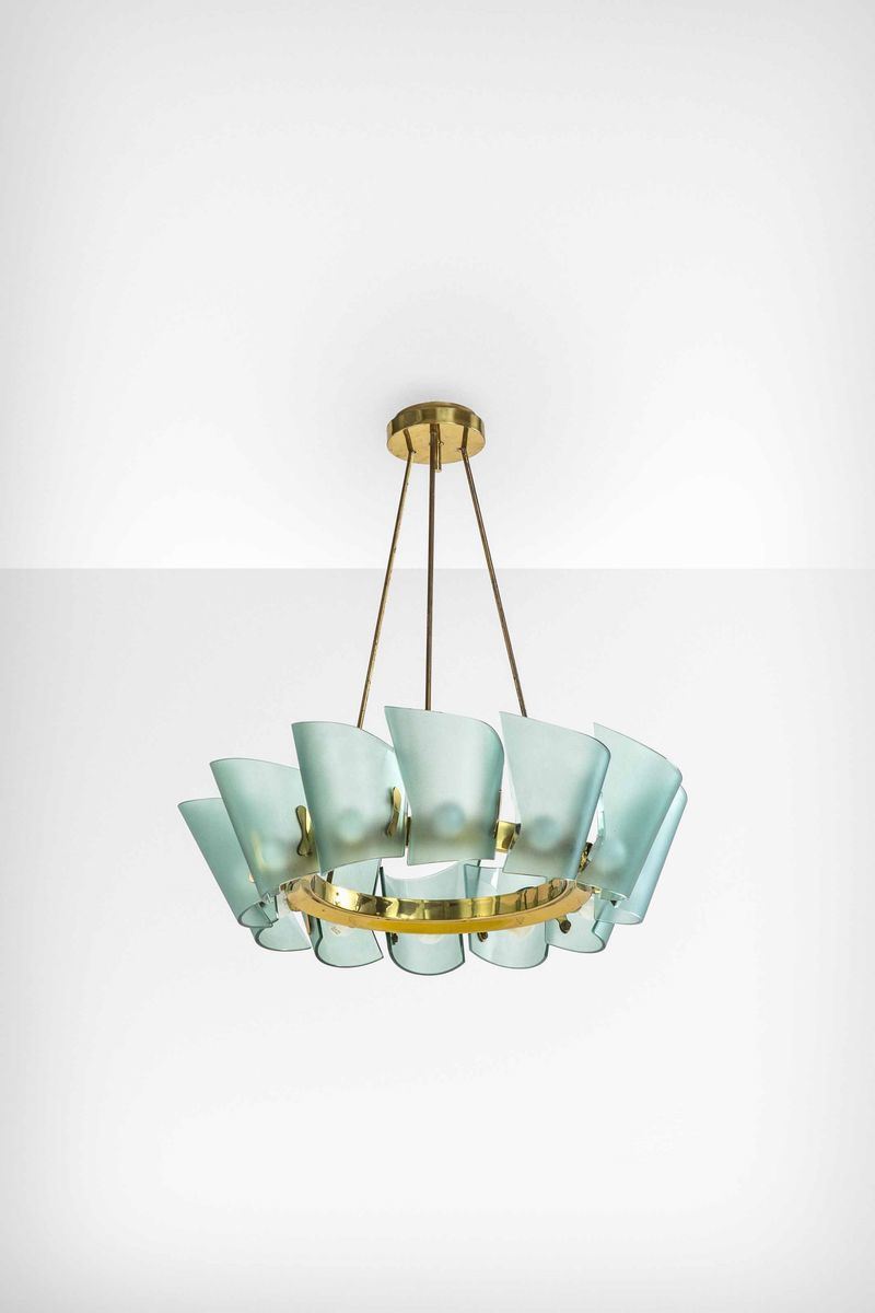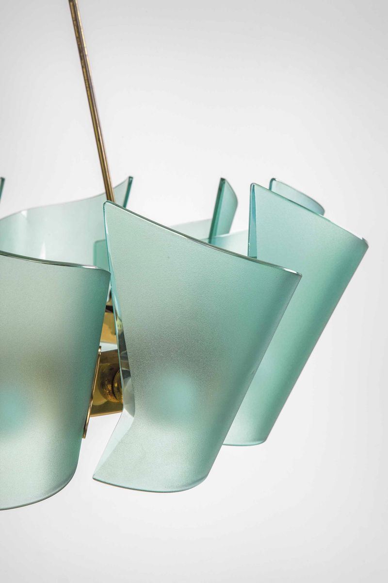 Struttura in ottone lucido e diffusori in vetro colorato, curvato, molato e satinato.