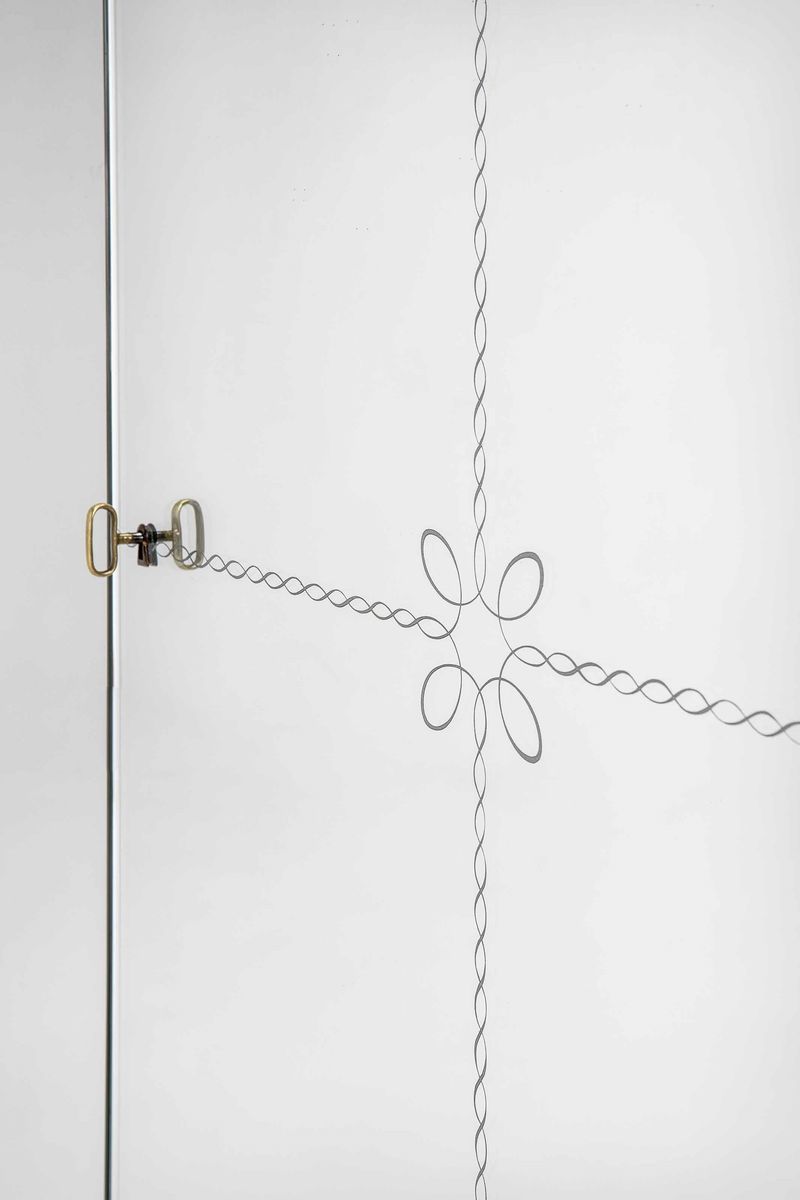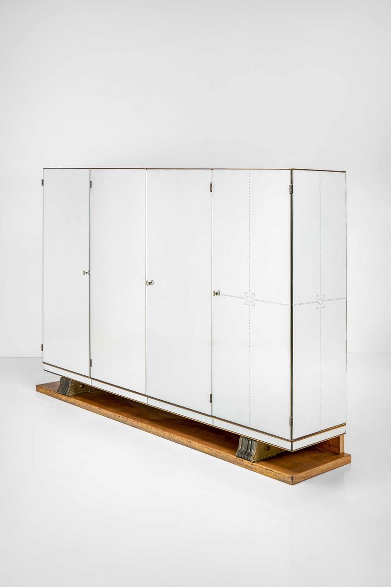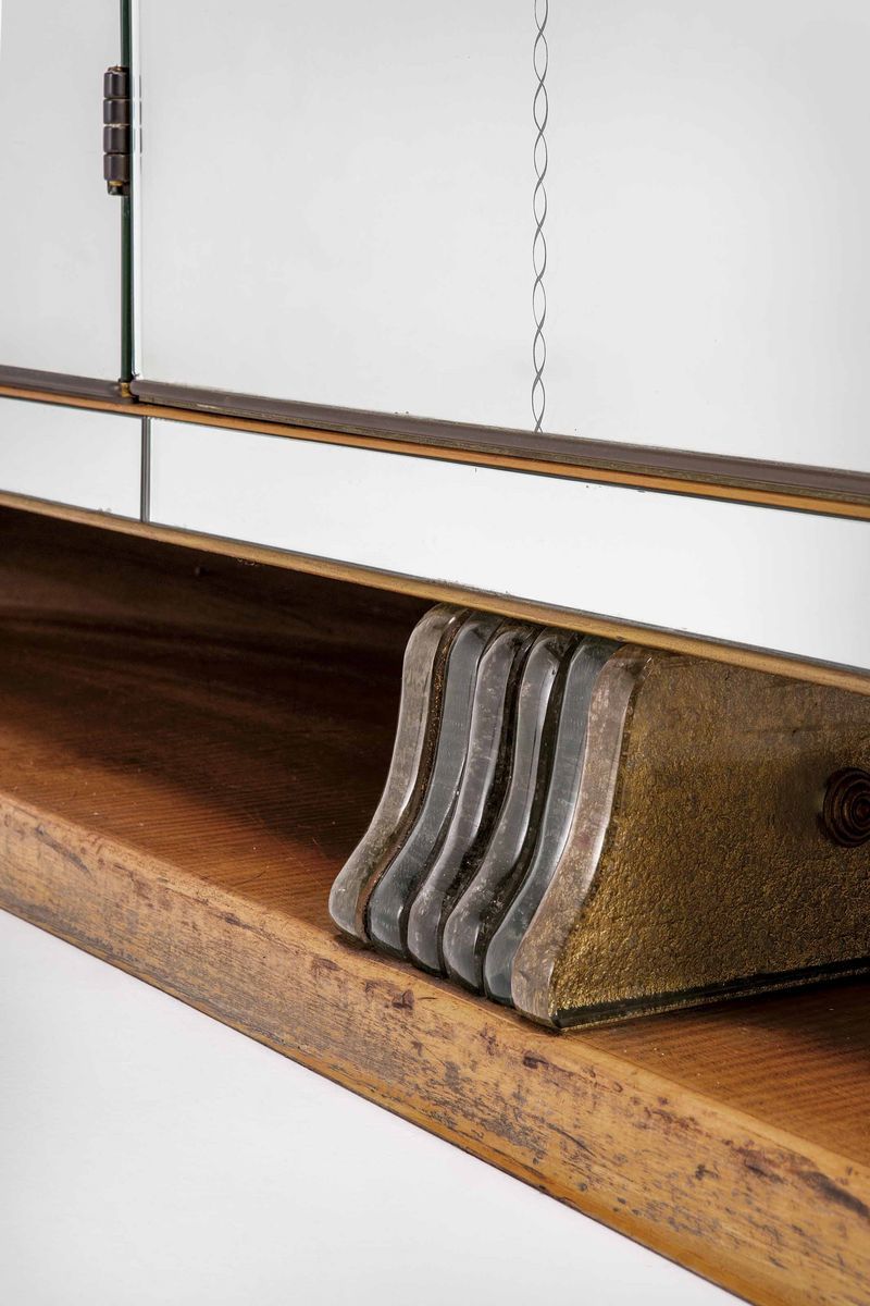Struttura in legno e sostegni composti dall’unione di lastre in cristallo di forte spessore decorato a foglia d’oro. Rivestimenti in vetro specchiato e vetro specchiato inciso. Internamente, apertura scorrevole a fisarmonica per accedere ad eventuale spazio retrostante