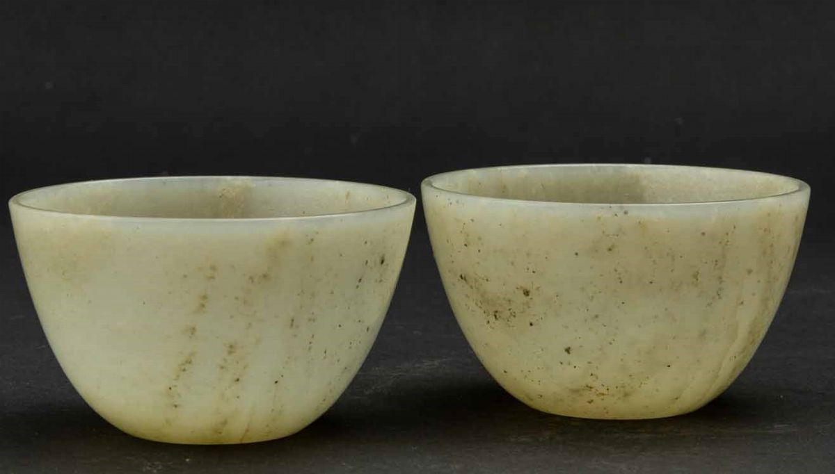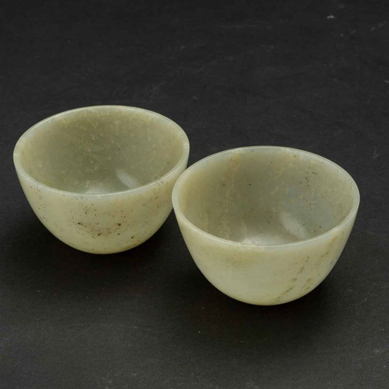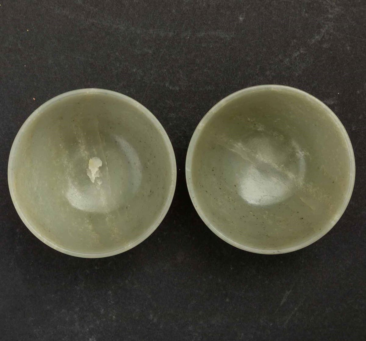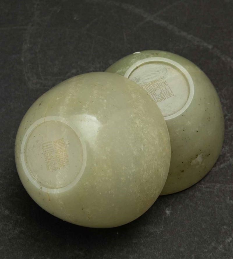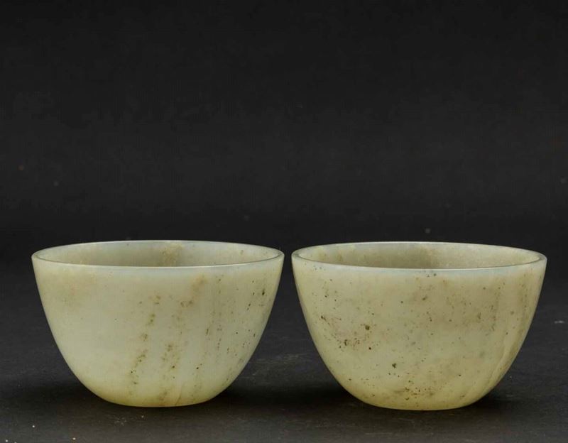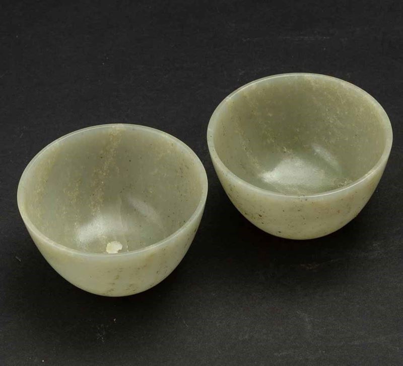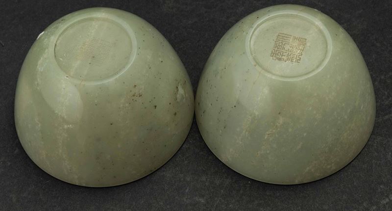 Due piccole coppe scolpite in giada Celadon, Cina, Dinastia Qing, marca e del periodo Qianlong (1736-1796)