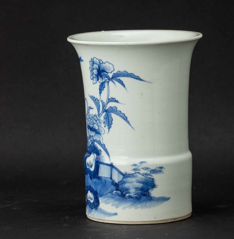 Vaso a tromba in porcellana bianca e blu con decoro naturalistico, Cina, Dinastia Qing, epoca Kangxi (1662-1722)