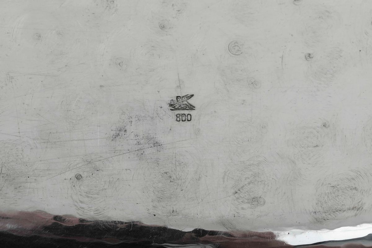 Antipastiera in argento fuso e cesellato e cristallo. Argenteria italiana del XX secolo, bollo dell'argentiere con leone di San Marco (Peruggia, Alessandria ?)