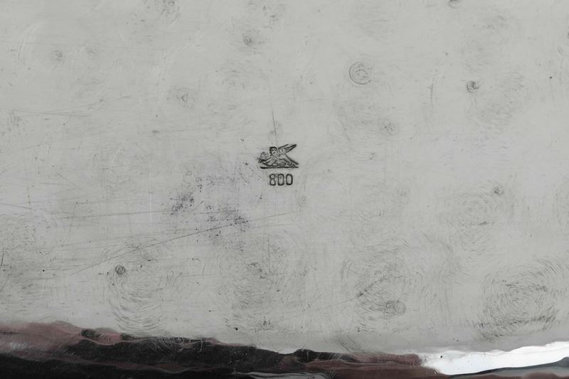 Antipastiera in argento fuso e cesellato e cristallo. Argenteria italiana del XX secolo, bollo dell'argentiere con leone [..]