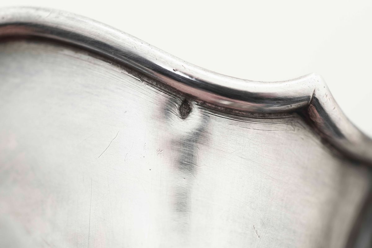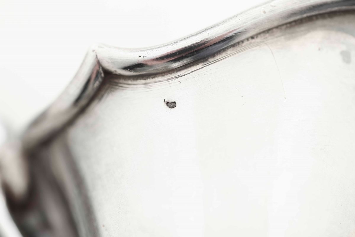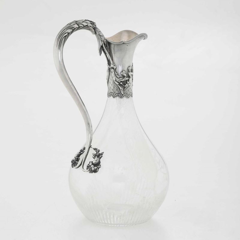 Brocca in vetro inciso e montatura in argento fuso e cesellato. Francia, inizi del XX secolo.