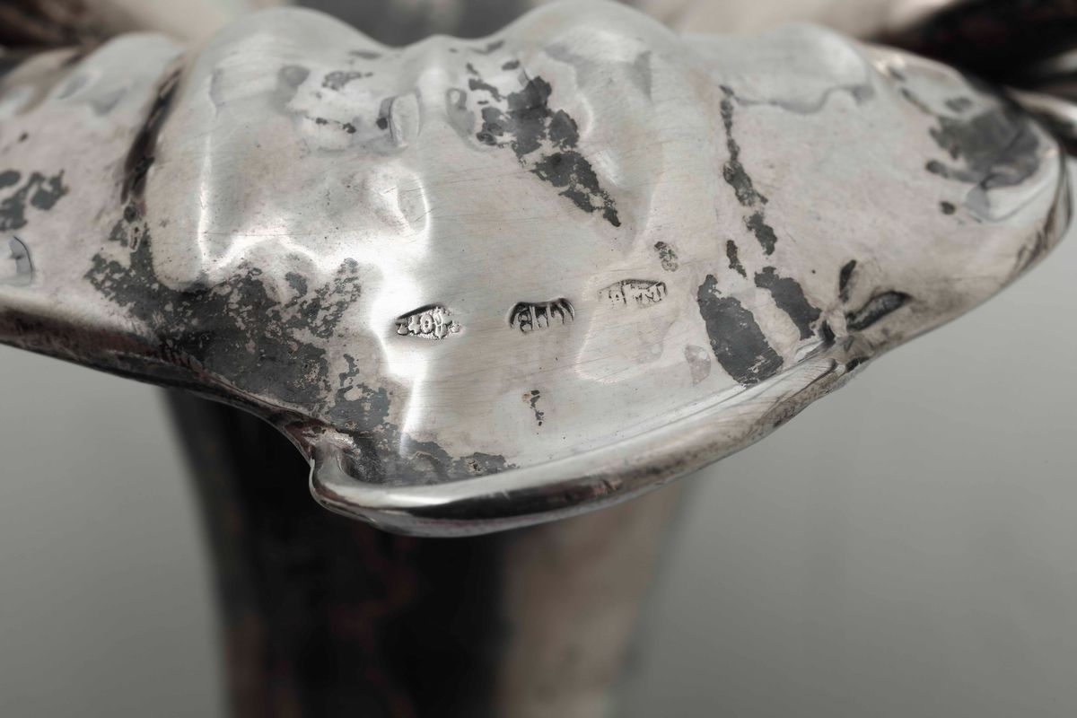 Candelabro centrotavola in argento fuso, sbalzato e cesellato. Argenteria milanese del XX secolo. Marchio con fascio littorio in uso dal 1935 al 1945. Argentiere Achille Proserpio