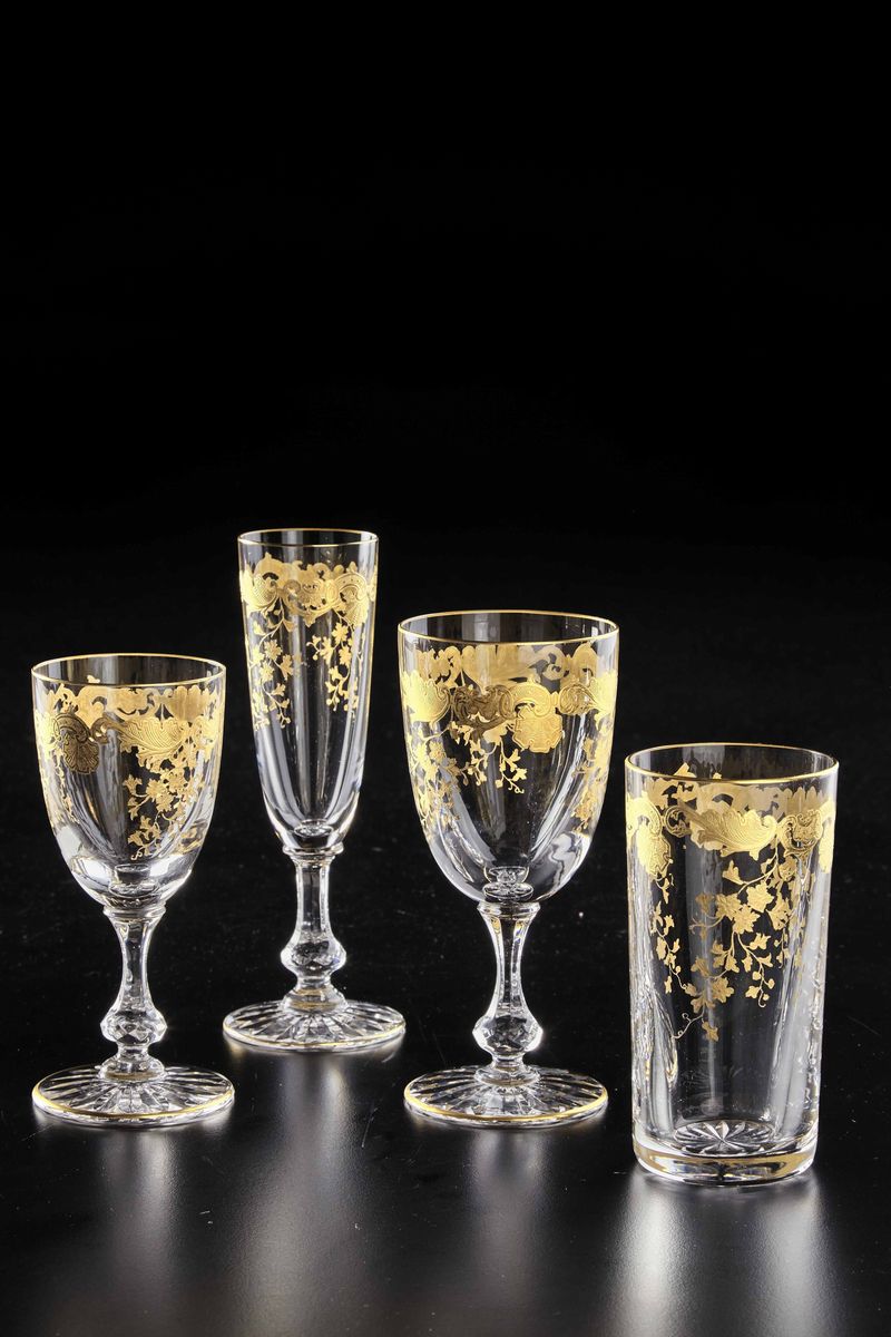 Questo raro set di bicchieri è uno dei servizi più eleganti e pieni di grazia tale da considerarsi una vera opera d’arte. Il fondo è decorato con un motivo a stella inciso alla mola, mentre le pareti sono intarsiate e lumeggiate in oro 24 carati con un prezioso ed elaborato motivo a rocailles e steli fioriti che esaltano la trasparenza del cristallo