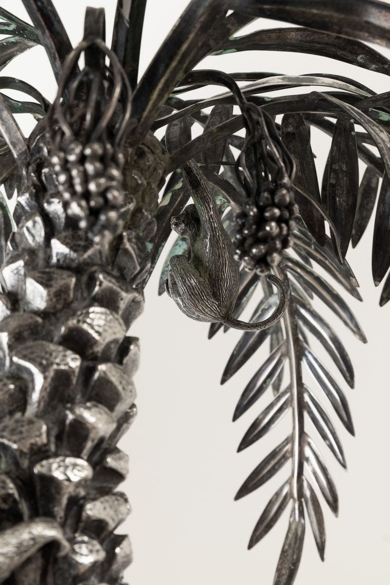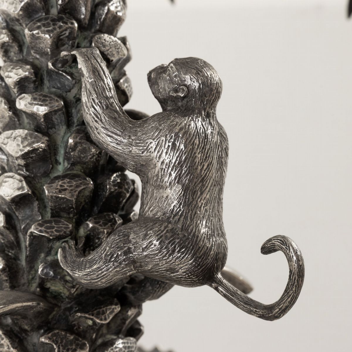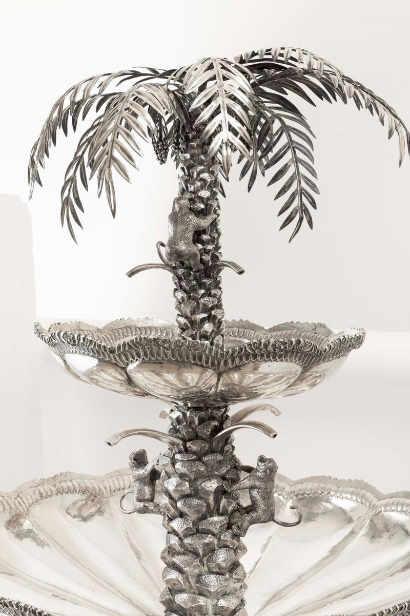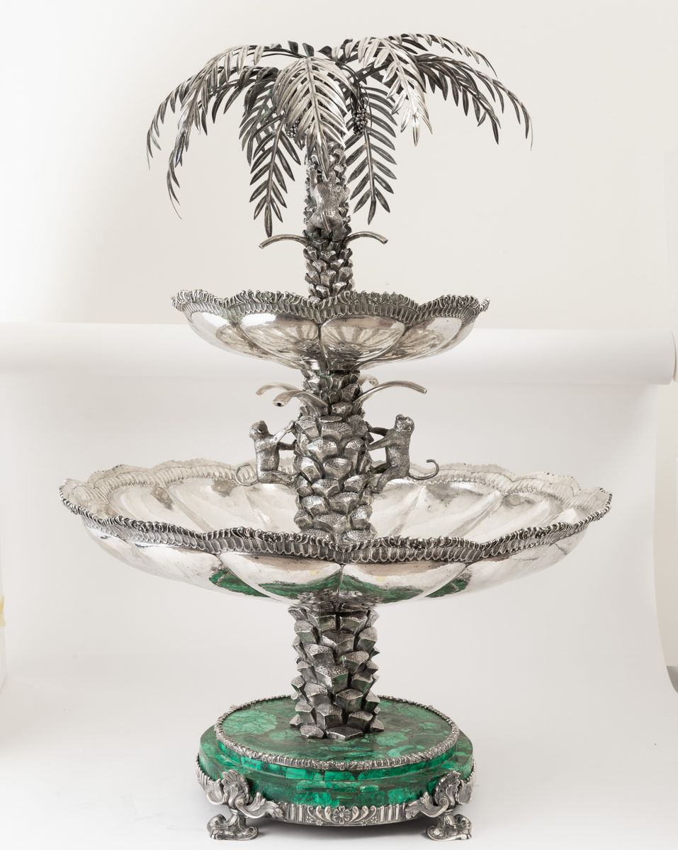 Fusto a foggia di palma poggiante su base in malachite e figure di scimmiette che si arrampicano sul tronco. Due vasche circolari baccellate che raccolgono gli zampilli d'acqua.