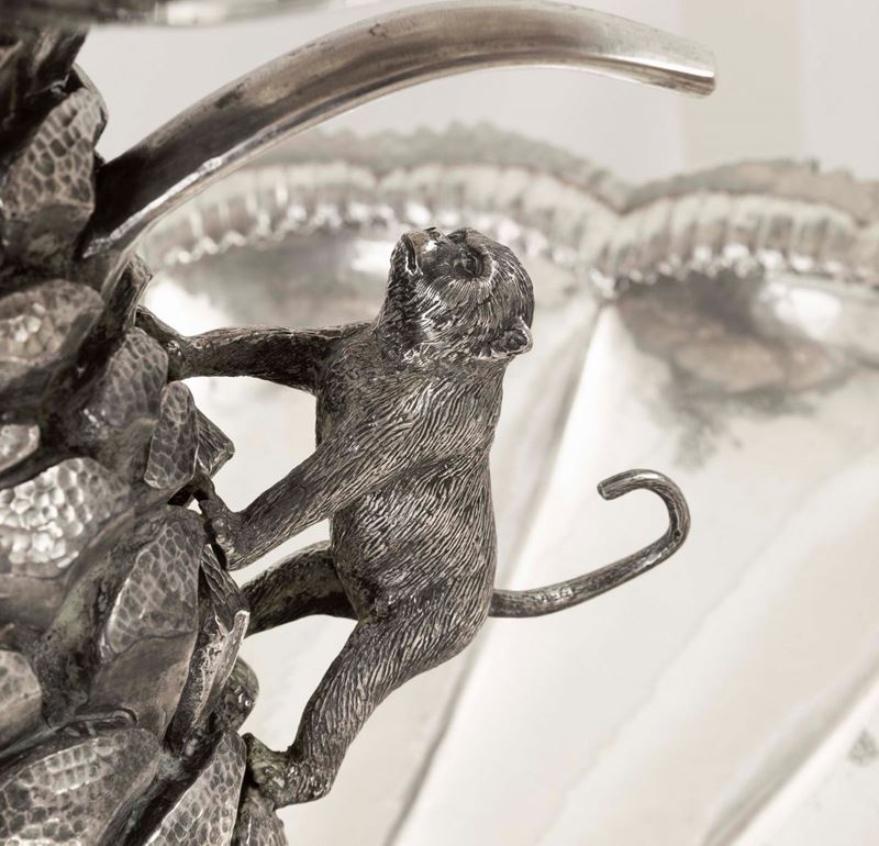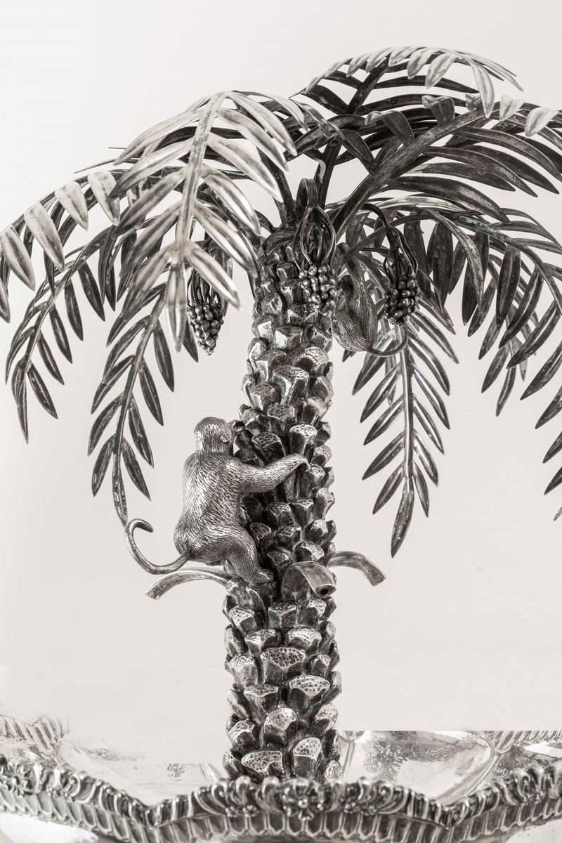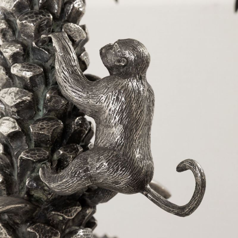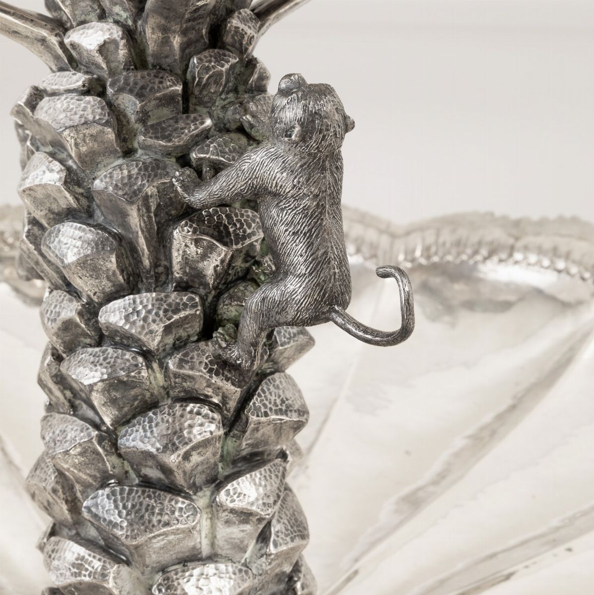 Fusto a foggia di palma poggiante su base in malachite e figure di scimmiette che si arrampicano sul tronco. Due vasche circolari baccellate che raccolgono gli zampilli d'acqua.