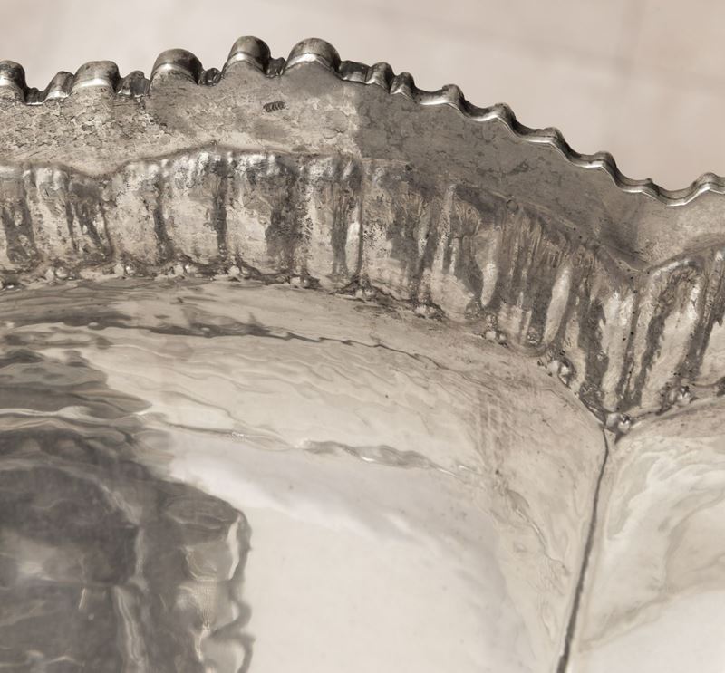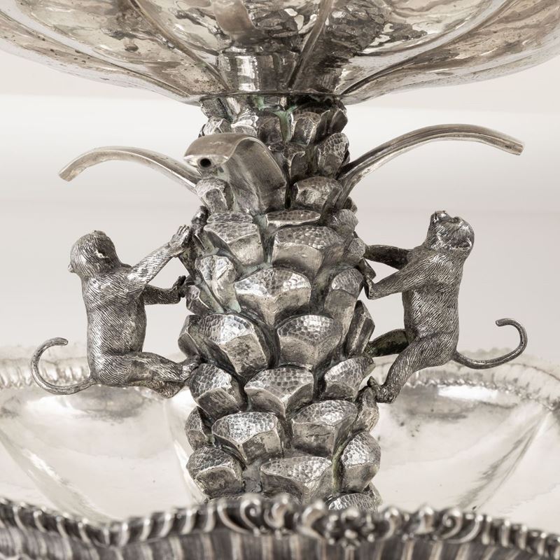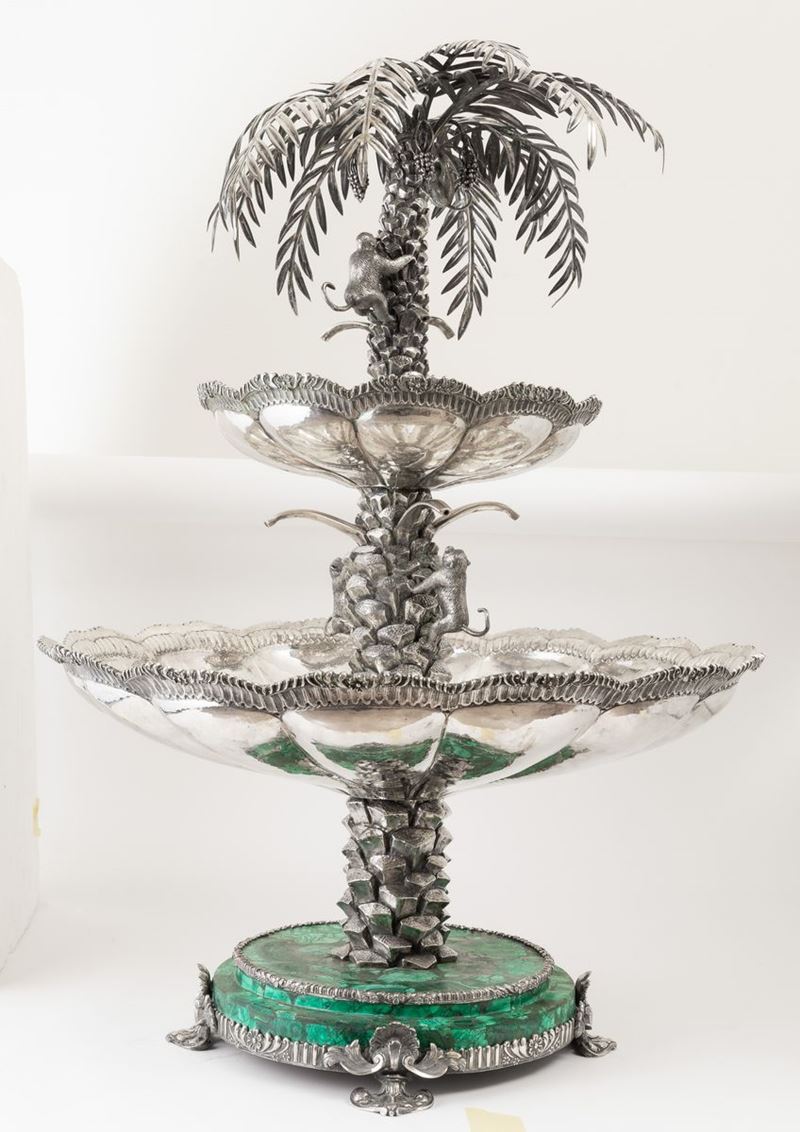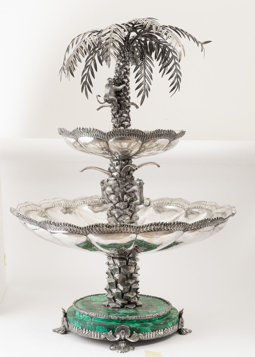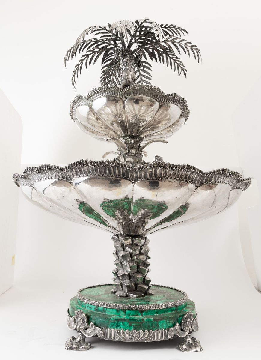 Monumentale fontana centrotavola. Argento fuso, sbalzato, cesellato e base circolare in malachite. Argenteria artistica [..]