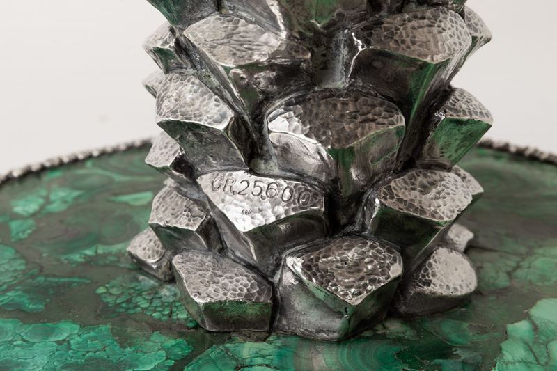 Monumentale fontana centrotavola. Argento fuso, sbalzato, cesellato e base circolare in malachite. Argenteria artistica italiana della prima metà del XX secolo