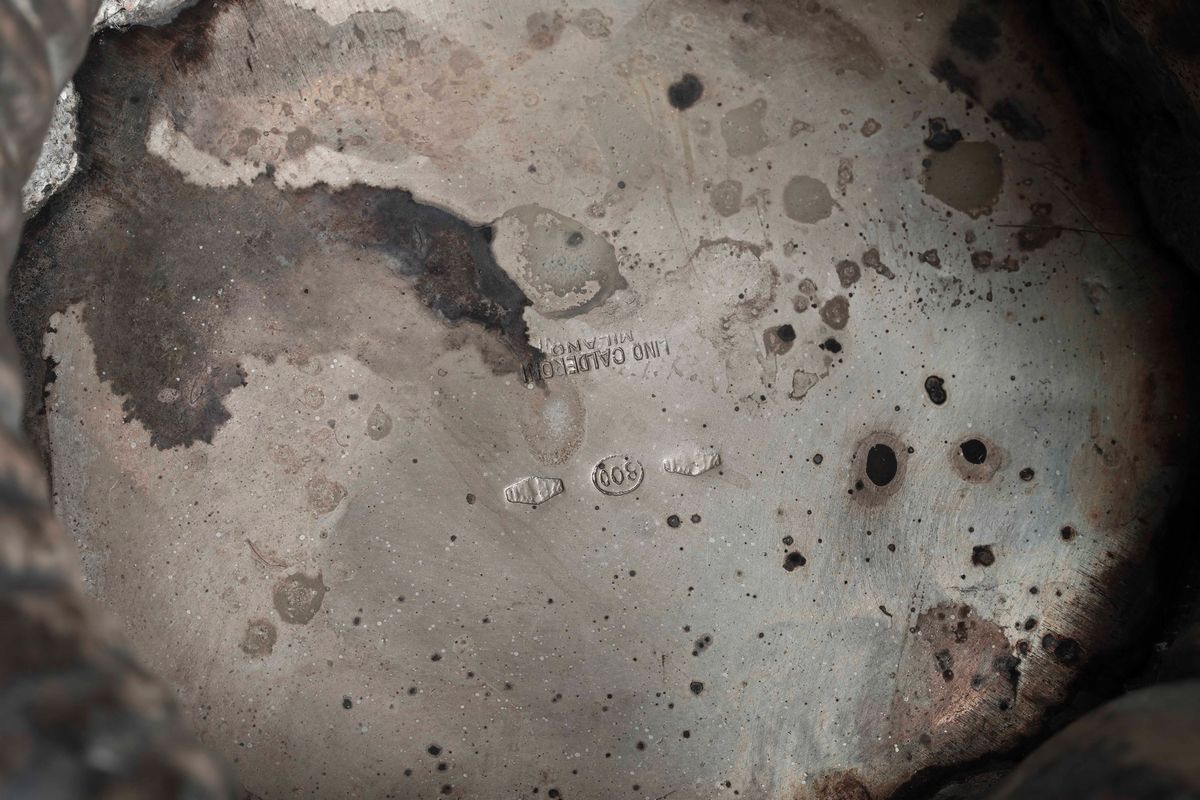 Monumentale vaso centrotavola in argento fuso e cesellato. Argenteria artistica milanese del XX secolo. Bollo con fascio [..]