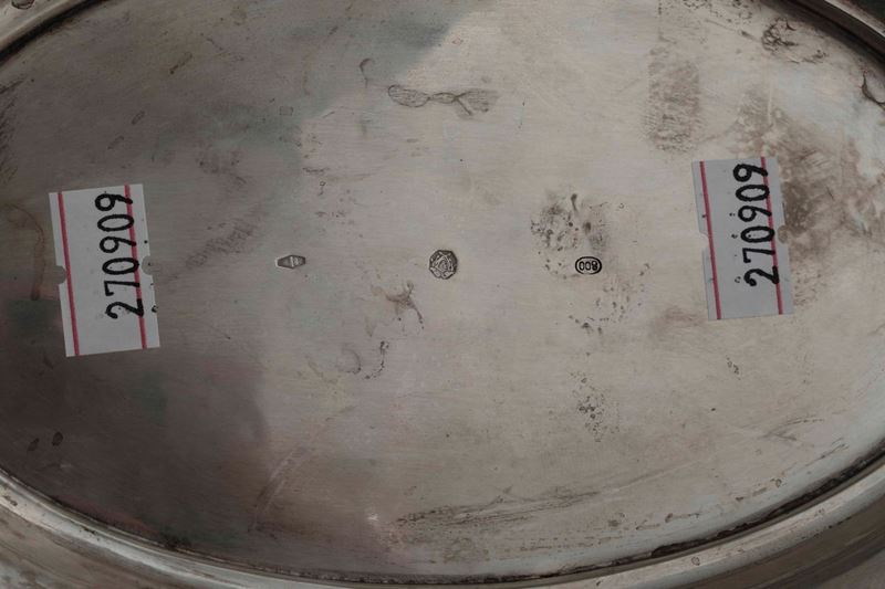 Portabottiglie in argento fuso e cesellato. Argenteria artistica milanese del XX secolo. Marchio con fascio littorio in uso dal 1935 al 1945. Argentiere Fassi Arno