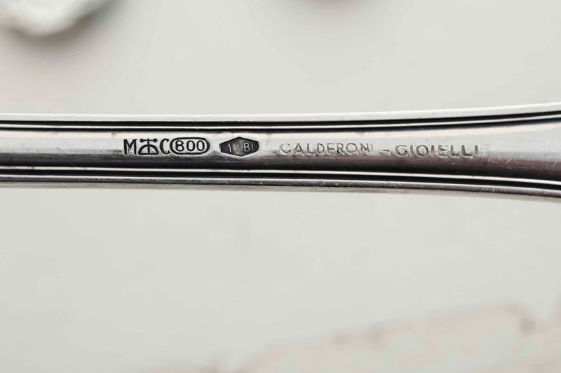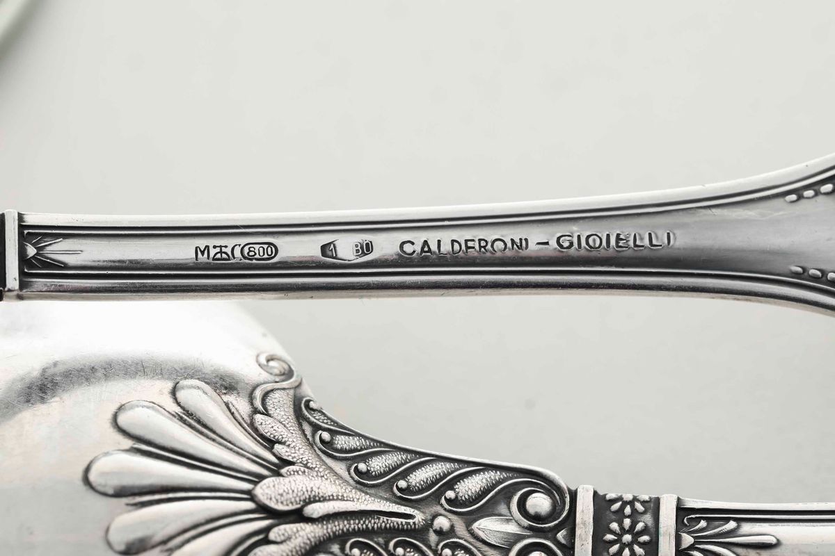 Servizio di posate in argento da 12 persone. Argenteria italiana del XX secolo. Argentiere Clementi, Bologna per Gioielleria Calderoni