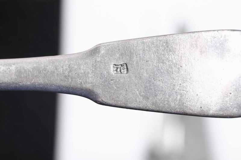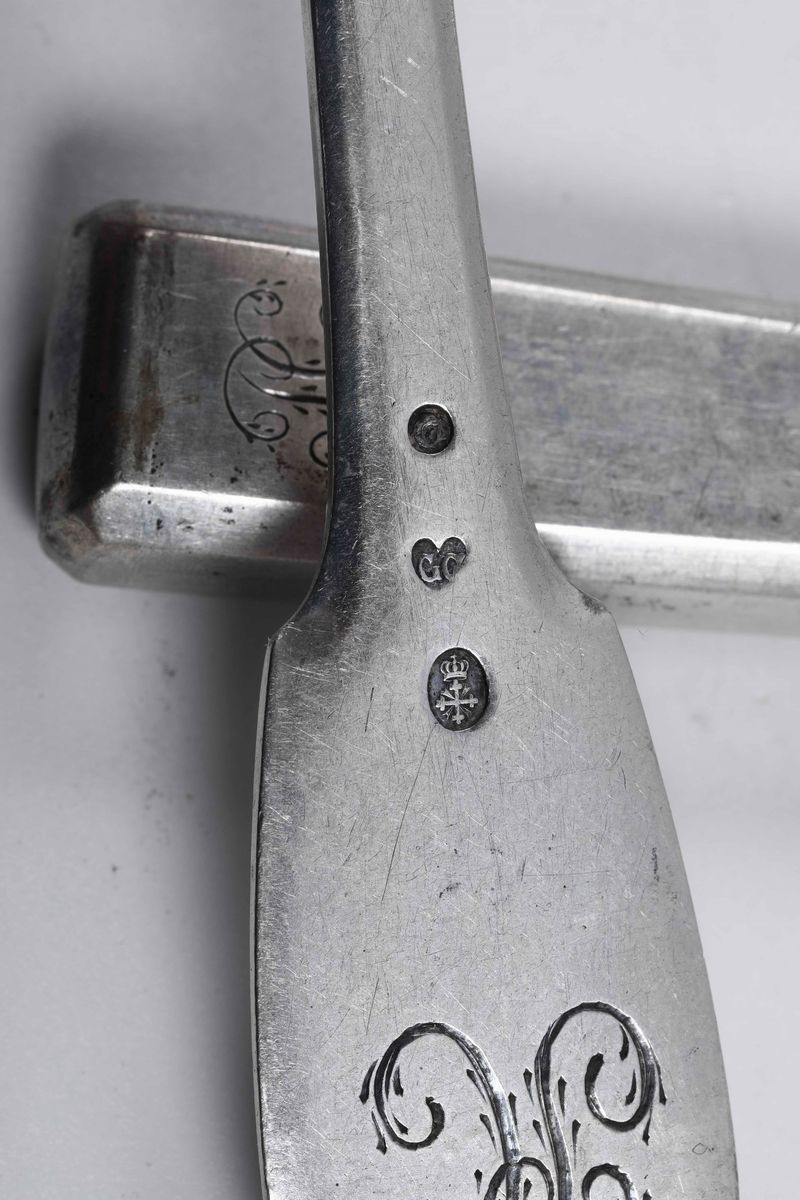 Servizio di posate per diciotto coperti in argento. Genova inizi XIX secolo, marchi differenti