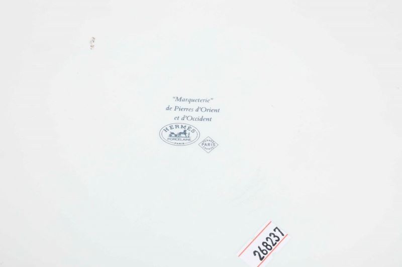 Porcellana. Marca: "Marqueterie de Pierres d'Orient et d'Occident"; "Hermès Porcelaine Paris" in simbolo grafico; "Hermès Paris France”, in blu. Diametro cm 34,4