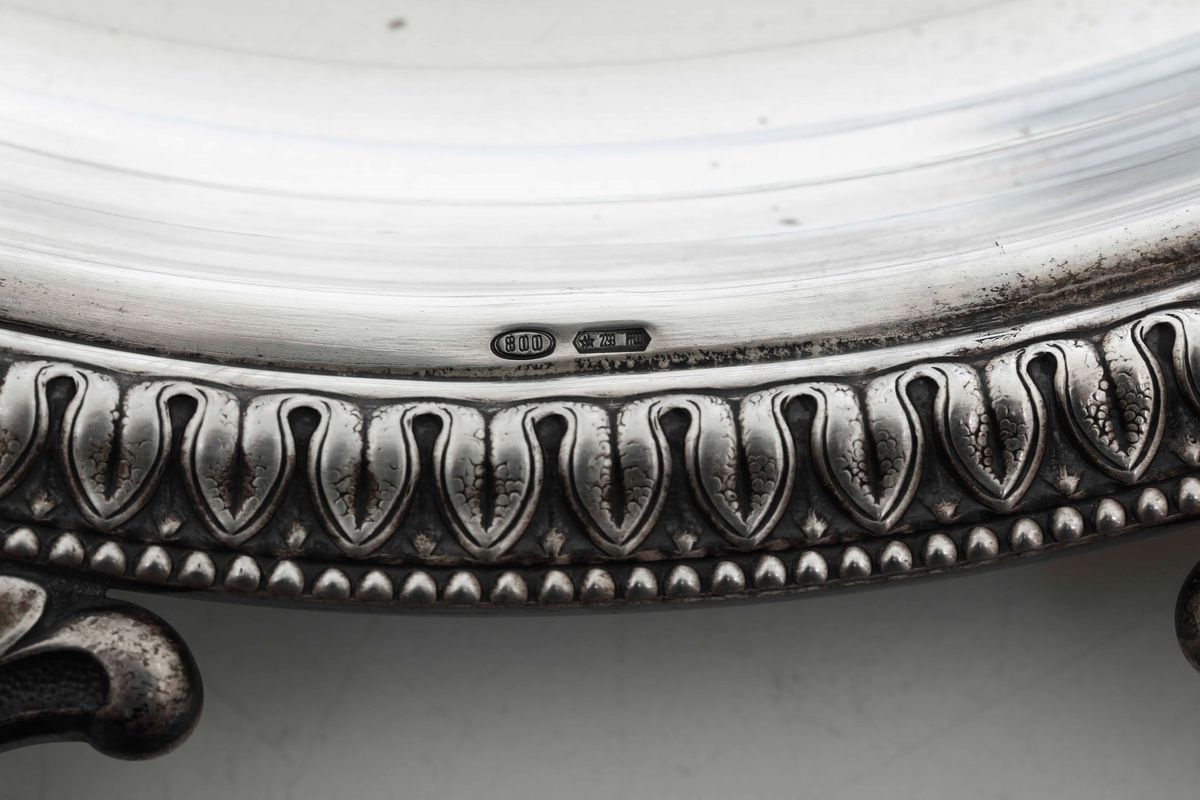 Vassoio ovale biansato in argento fuso e cesellato. Argenteria veneta del XX secolo, Argentiere Rino Greggio, Padova