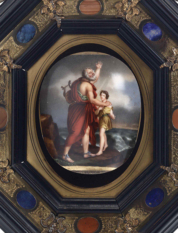 cm 10x9,5 Dipinto su porcellana, entro cornice in legno modanato ed ebanizzato con finimenti in bronzo dorato e pietre dure (non pertinente) Sul retro etichetta cartacea "Emilio Ercolani via Guicciardini 5 Firenze"