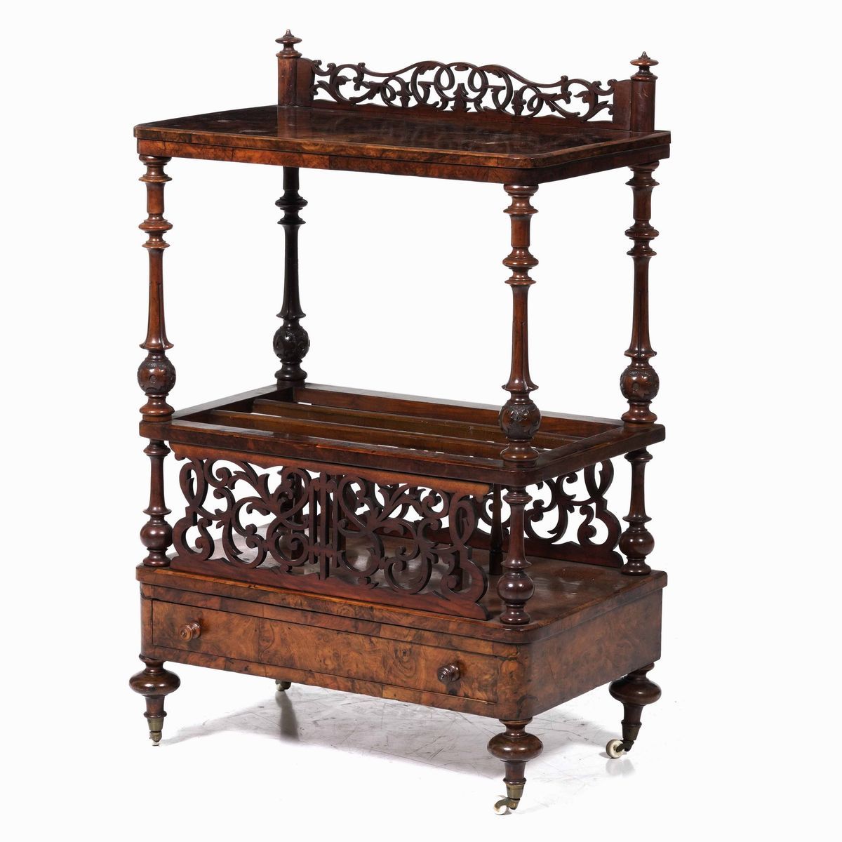 Etagere in legno intagliato e lastronato in radica. XIX secolo