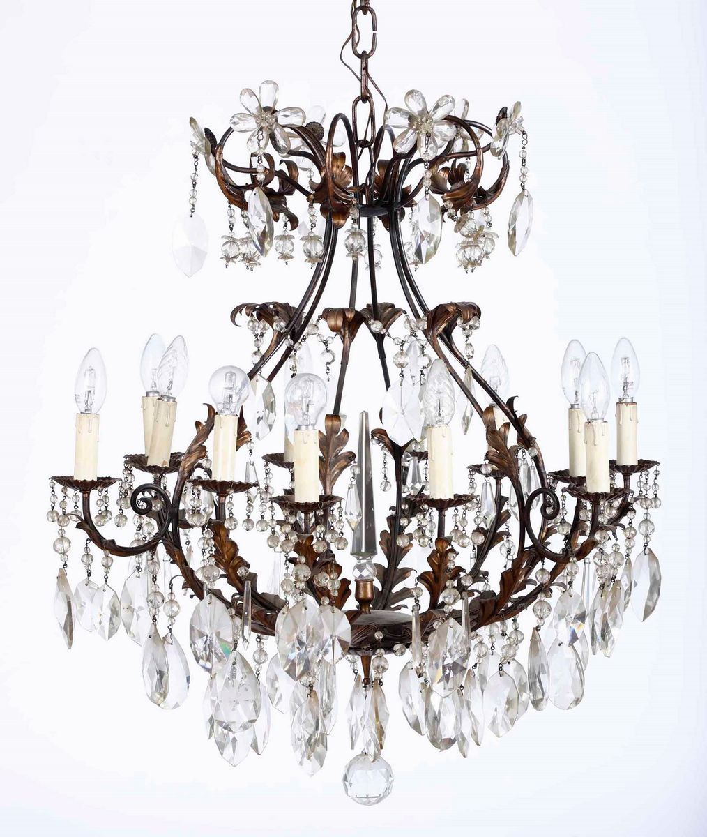 Lampadario con struttura in metallo e pendenti in vetro molato. XIX-XX secolo