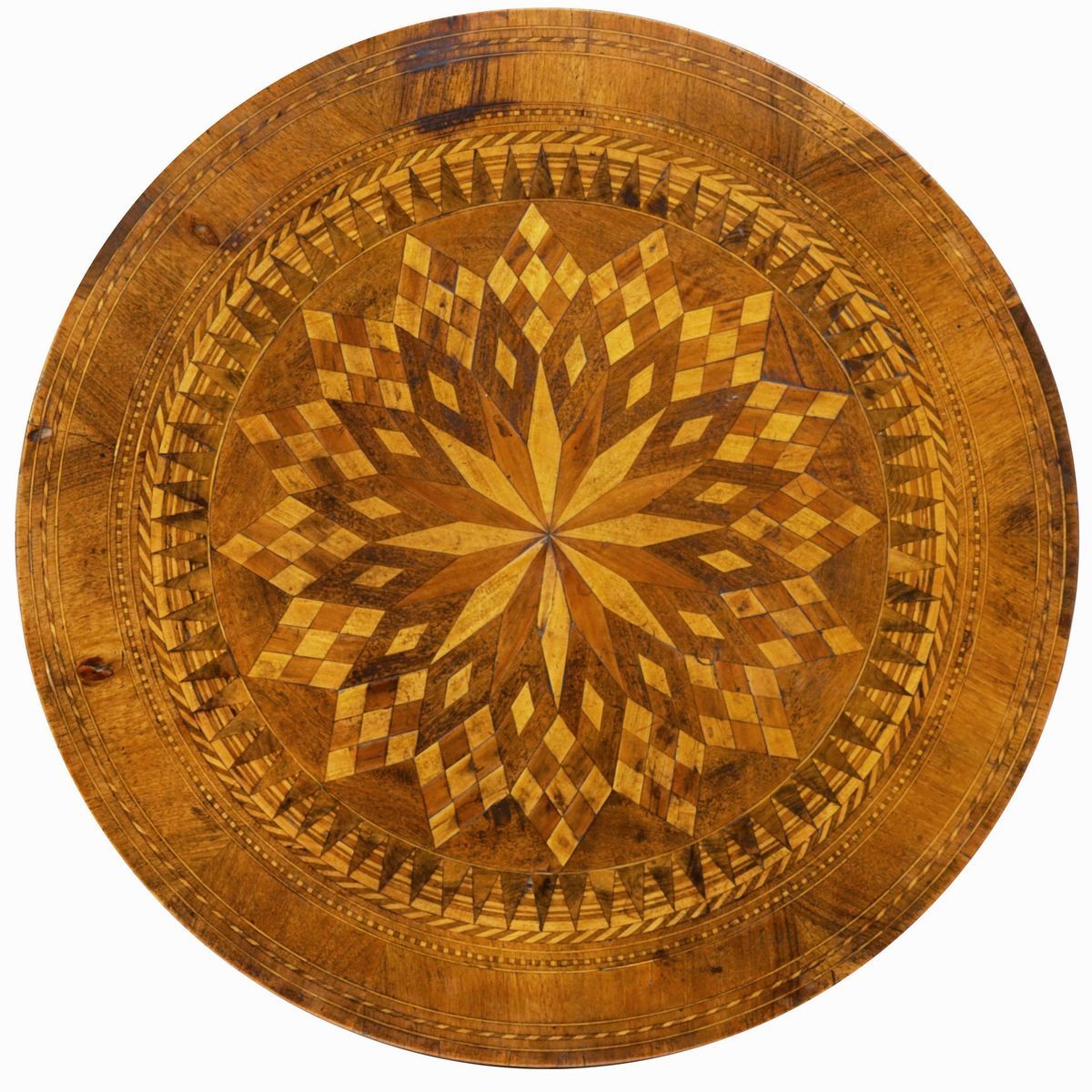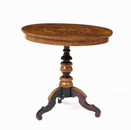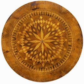 Tavolo sorrentino con piano di forma circolare lastronato e intarsiato a motivi geometrici. XX secolo