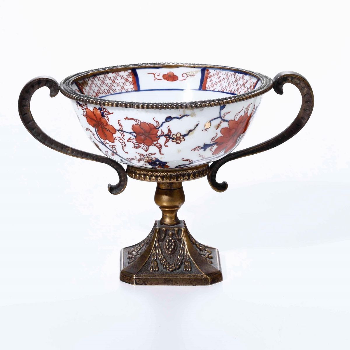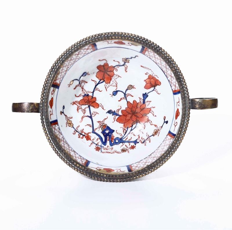 Tazza in porcellana con decori floreali con base e manici in bronzo Manifattura del XIX secolo