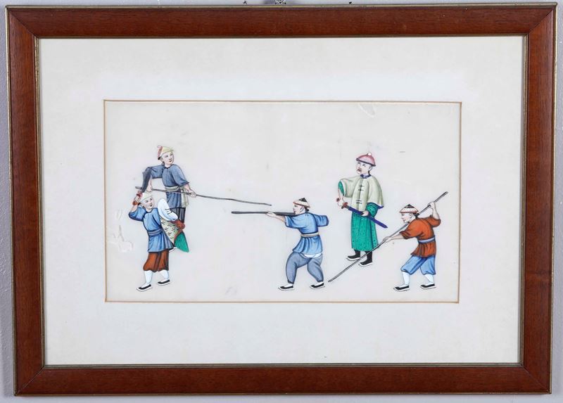 Ventaglio dipinto e piccolo dipinto su carta di riso. Cina XX secolo