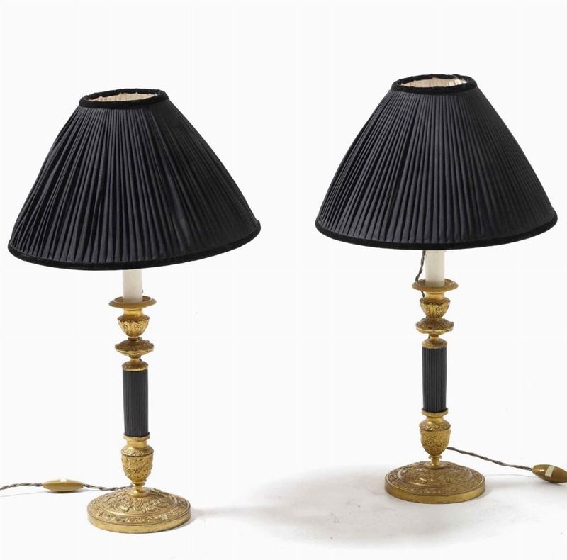 Coppia di candelieri in bronzo brunito e dorato. Francia, epoca Carlo X