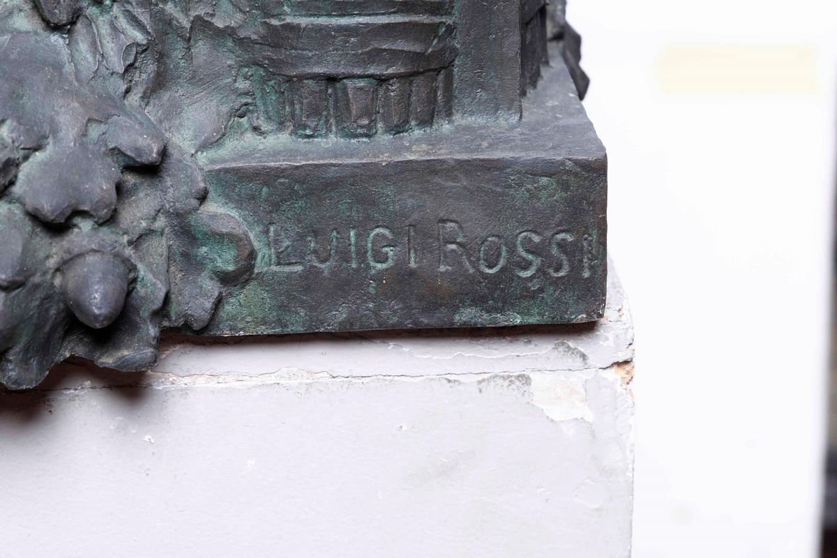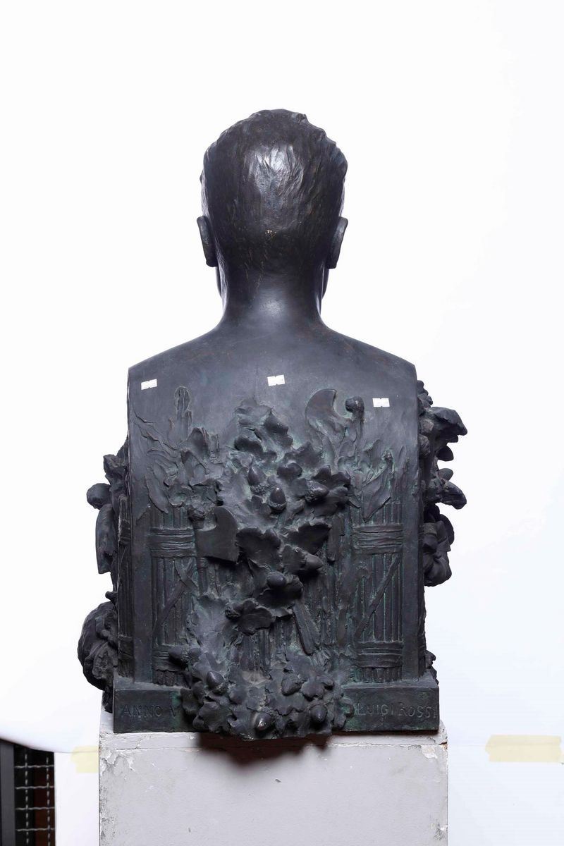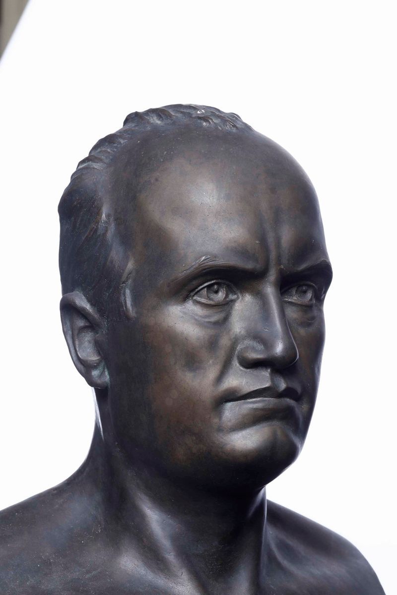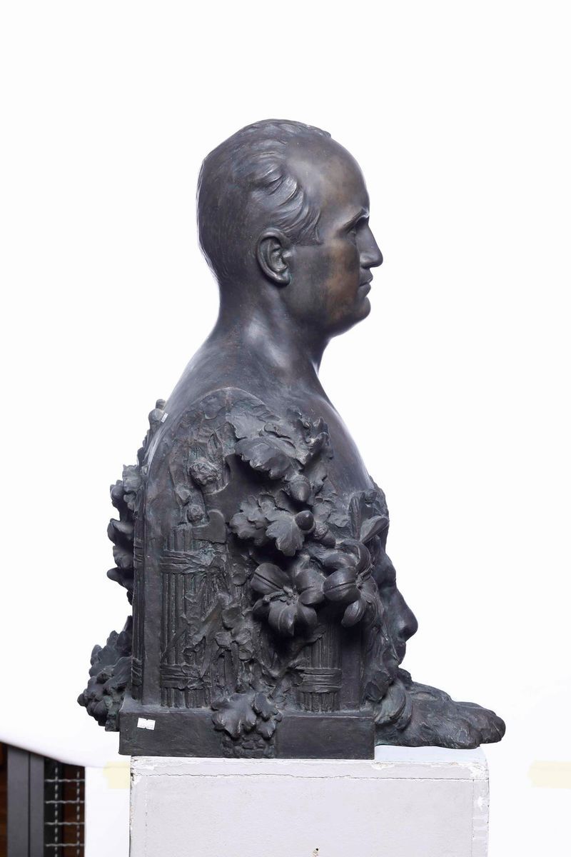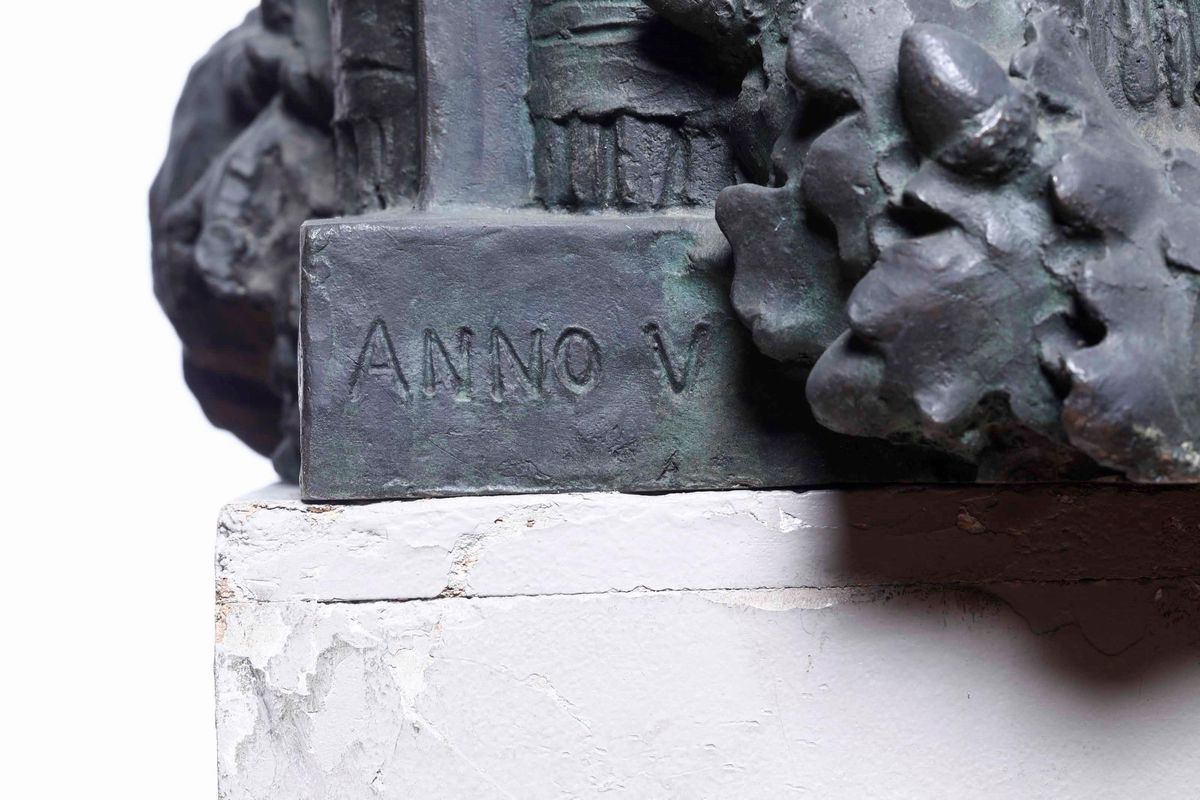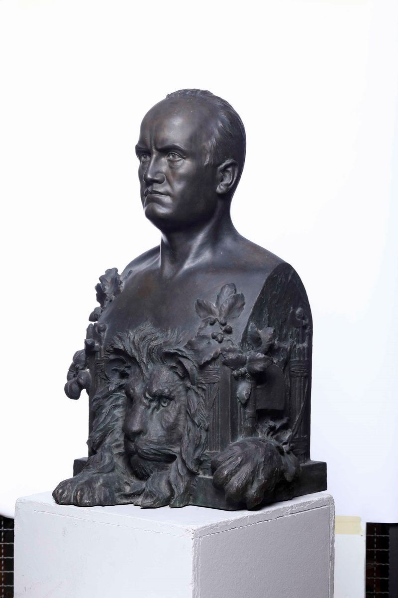 Importante busto celebrativo del Duce ricco di immagini allegoriche che legano l’epica fascista alla gloria dell’Antica Roma come i fasci littori repubblicano ed imperiale uniti ai serti di quercia ed alla figura del leone antichi simboli di virtù e forza.