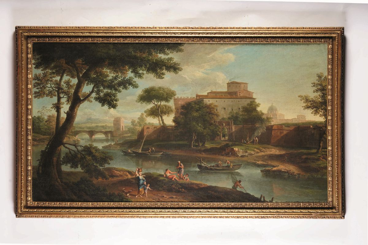 Paesaggi romani con figure in riva al fiume, il ponte Nomentano e rovine architettoniche