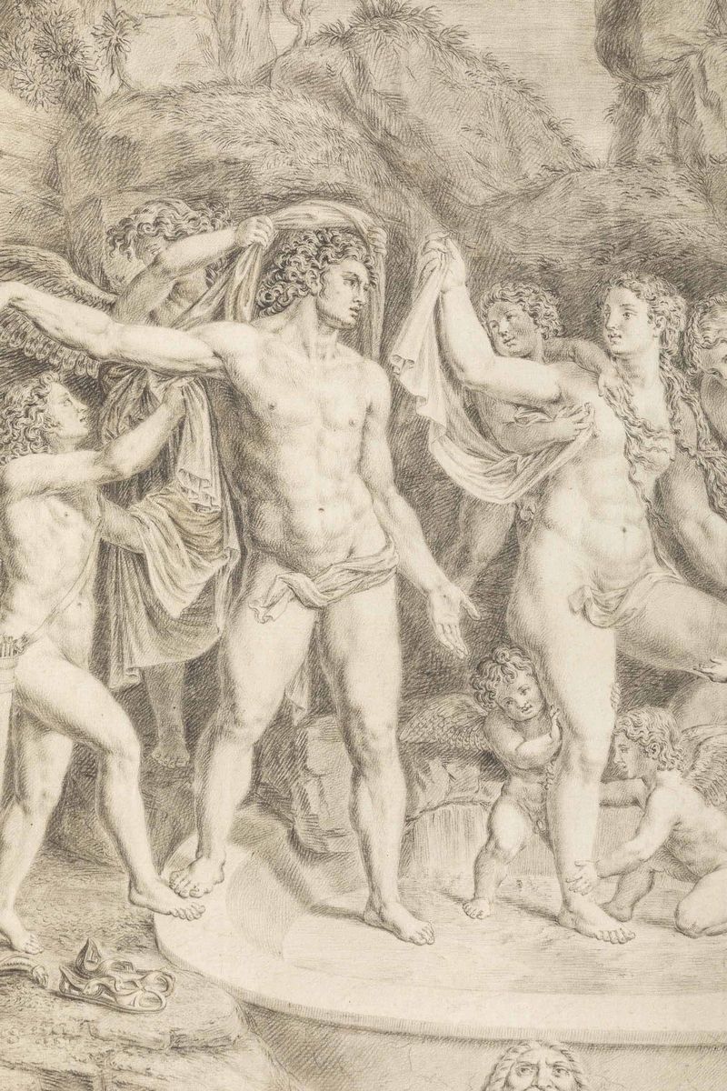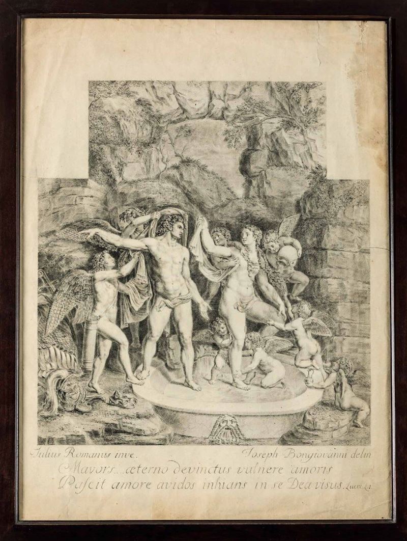 Il soggetto raffigurato in questo disegno dall'abile mano del incisore Giuseppe Bongiovanni, come esplicato dall'iscrizione posta lungo il margine inferiore, riprende la celebre composizione ideata da Giulio Romano per la decorazione ad affresco di Palazzo Te a Mantova.
