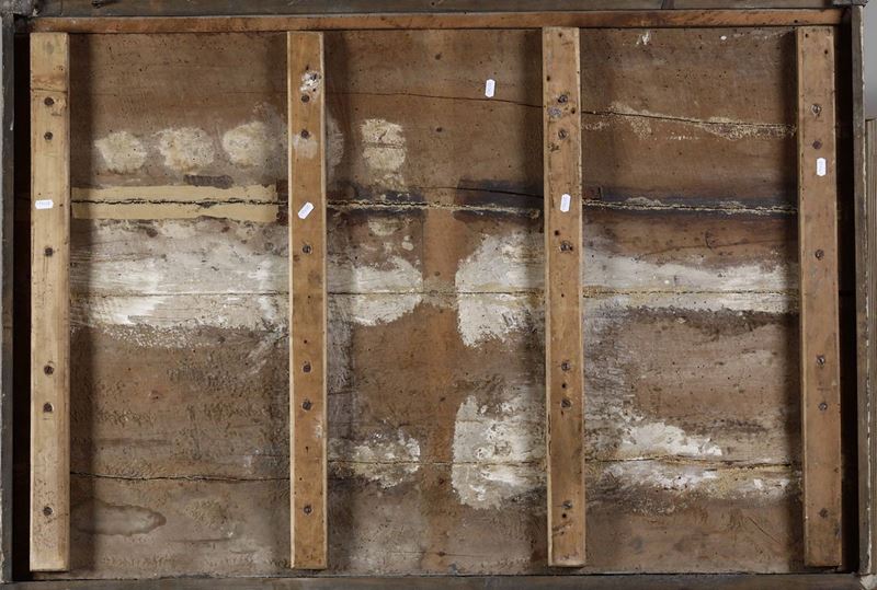"Questo dipinto è stato eseguito su cinque tavole di ineguale altezza giunte orizzontalmente, consolidate sul retro da quattro traverse verticali applicate tramite viti in tempi relativamente recenti. Questo consolidamento invasivo e improprio ha provocato alcune fratture del supporto che si sono ripercosse sulla superficie dipinta. Antiche cadute di colore lungo le linee di congiunzione delle tavole sono state mascherate in passato con stuccature e con estese ridipinture che alterano la qualità figurativa del dipinto e ne rendono difficile la decifrazione stilistica. Nonostante questa situazione compromessa, l’opera conserva parte dell’antica cornice polilobata e, intatta, la bella doratura del fondo decorata a fiorami incisi a punzone.