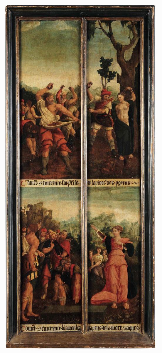 Scuola di Bruxelles del XVI secolo Storie di Santa Eremenziana martire con ritratto di committente