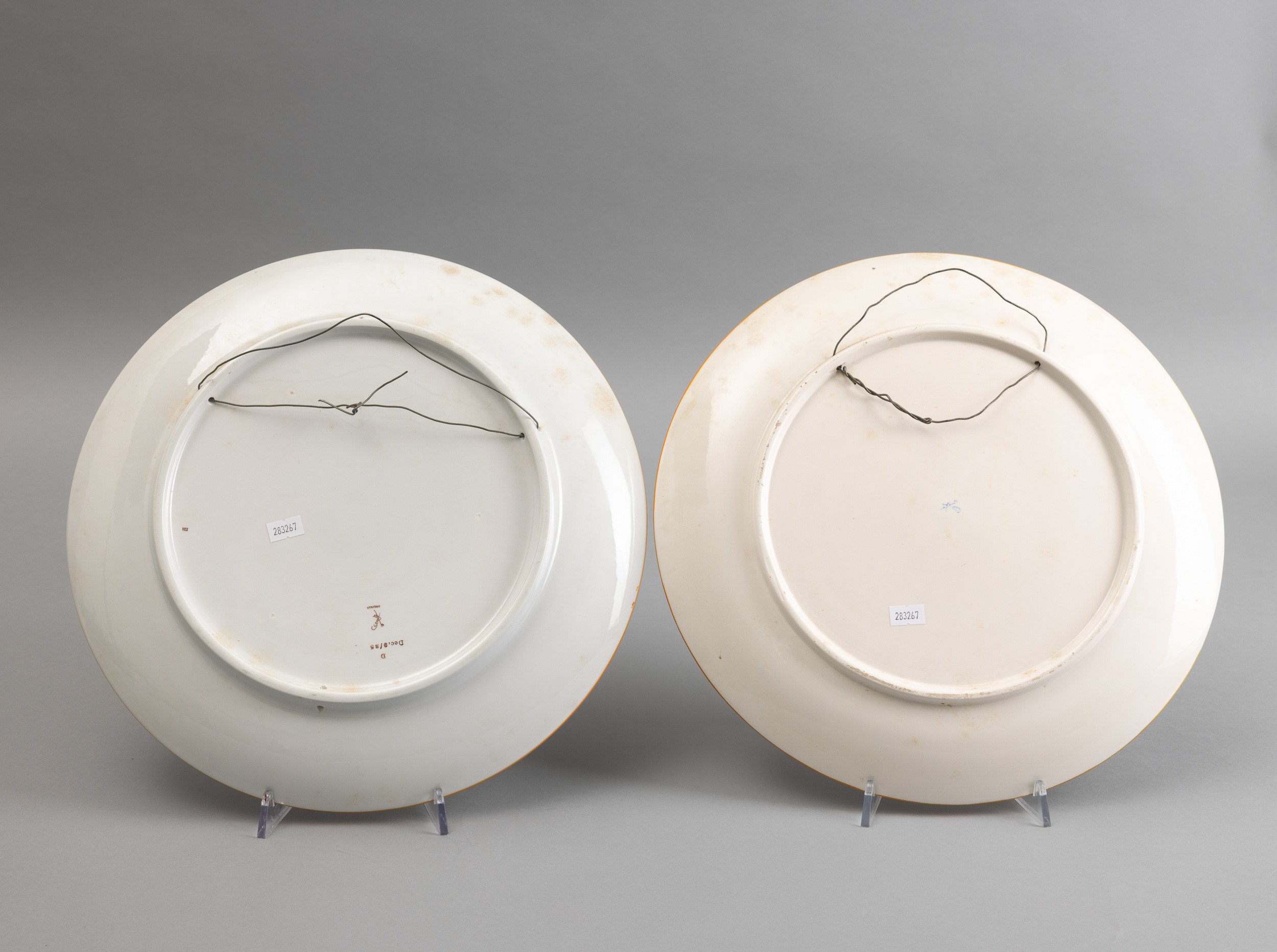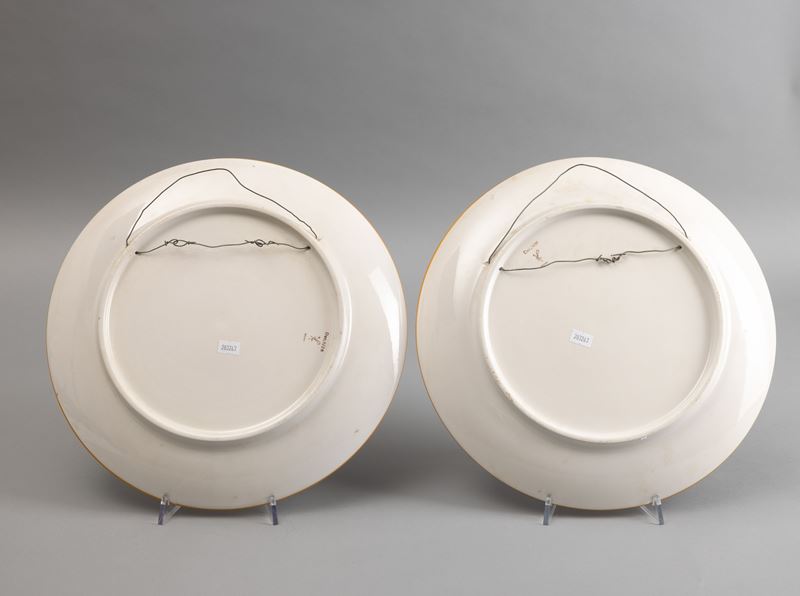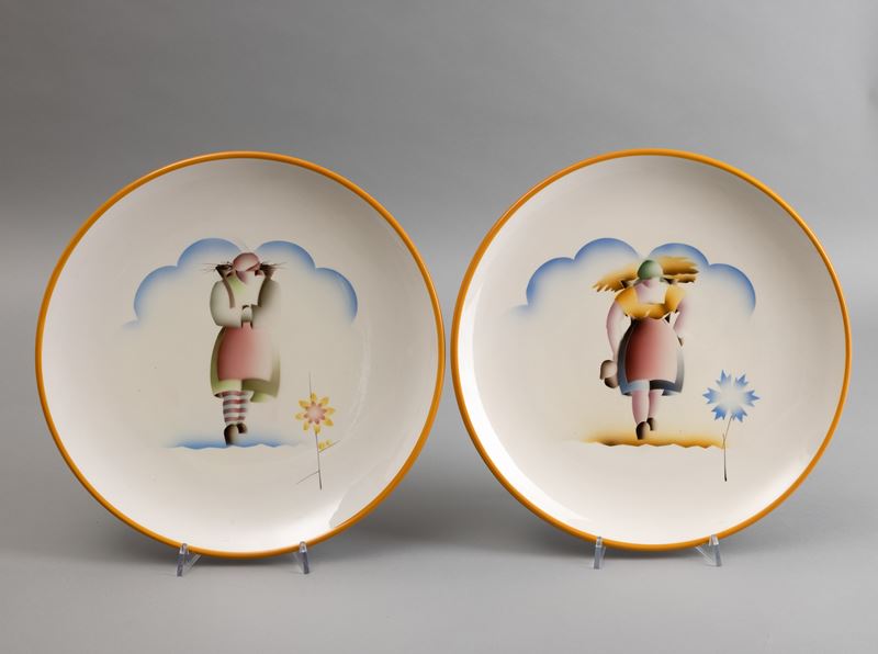 Lotto formato da quattro piatti in terraglia con figura di donna rappresentante le quattro stagioni, decorata all’aerografo.