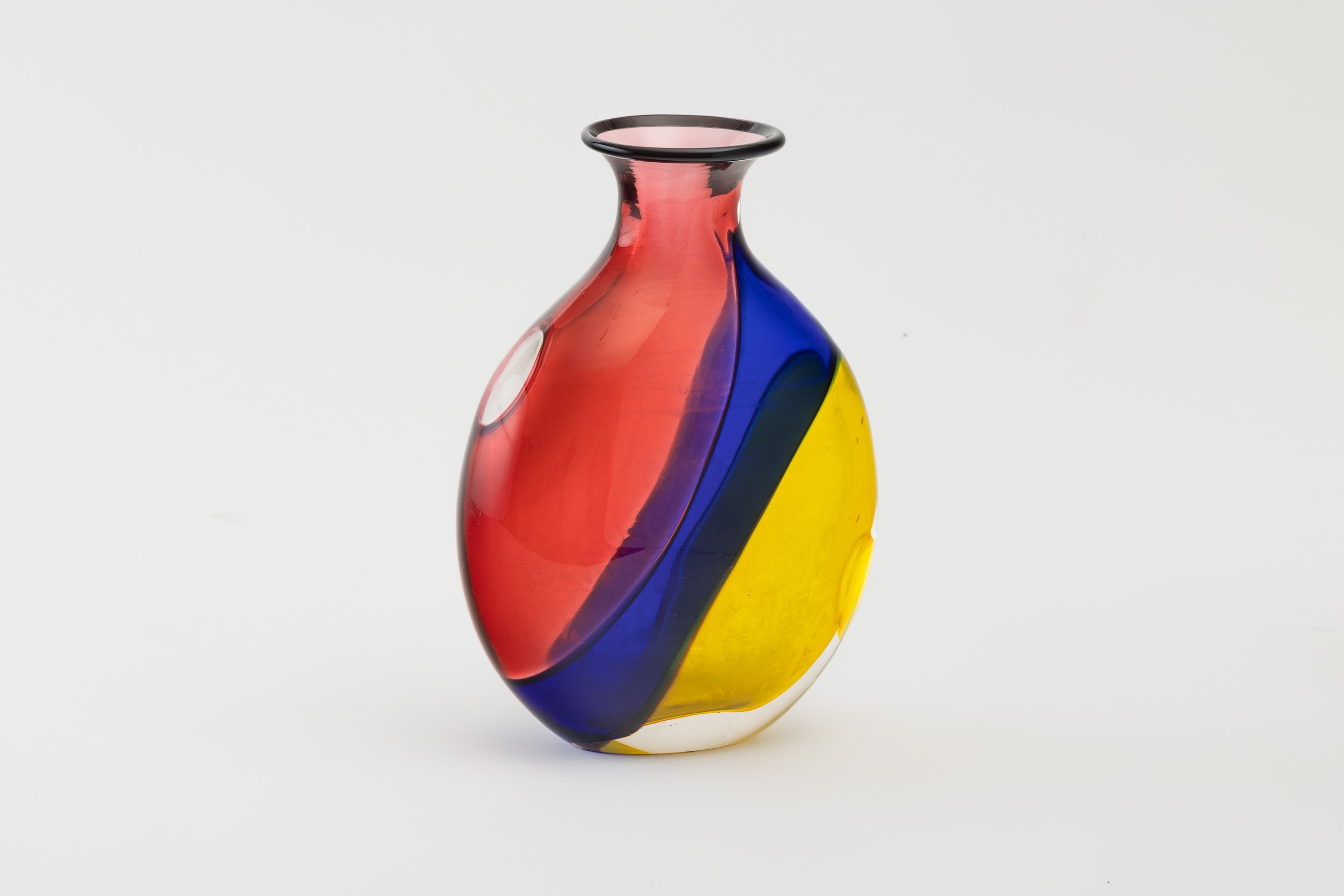 Vaso a fiasca schiacciato in vetro sommerso con decoro di fasce policrome, collo ad anello applicato.