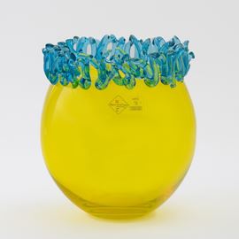 Vaso sferico serie Coralli in vetro soffiato con applicazioni a ramo turchesi.